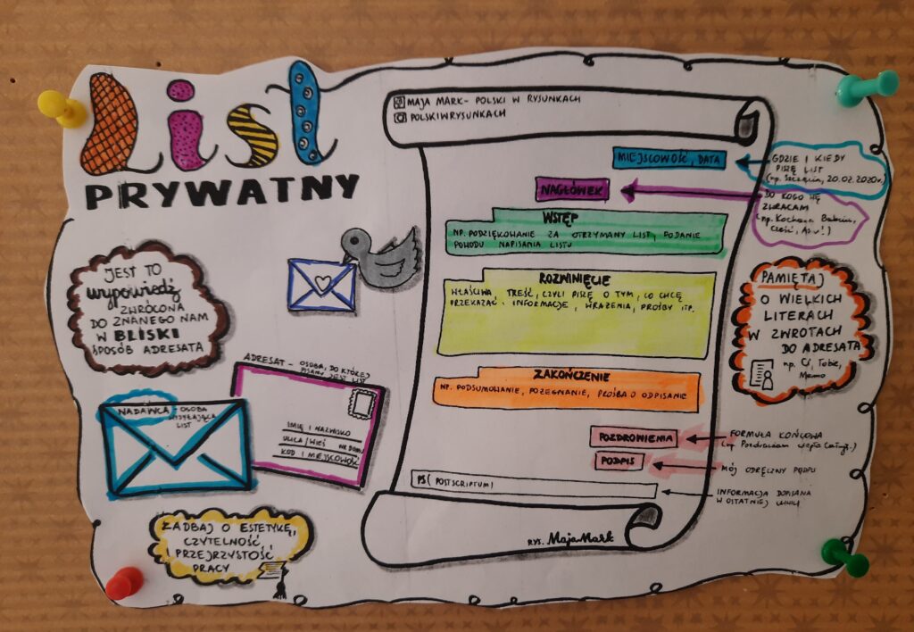 Uczniowie doskonalili umiejętność pisania listów do najbliższych – rodziców, dziadków, dalszych krewnych oraz przyjaciół. W trakcie zajęć utrwalili wiedzę na temat prawidłowego rozmieszczenia danych nadawcy i odbiorcy a także miejsca na znaczek pocztowy. Była to również cenna okazja do przypomnienia i utrwalenia własnego adresu zamieszkania.