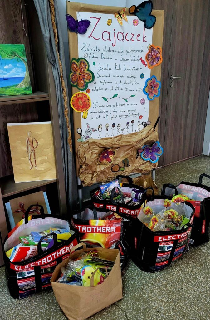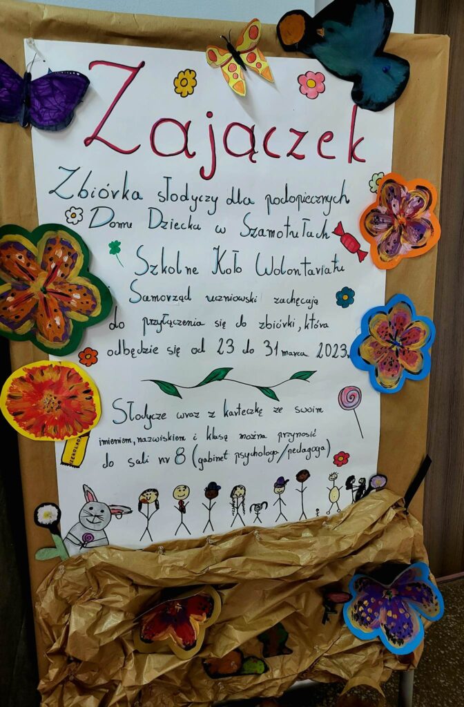 Szanowni Rodzice, Drogie Dzieci, Szkolne Koło Wolontariatu serdecznie dziękuje wszystkim tym, którzy włączyli się w akcję „Zajączek”. Dzięki Wam dzieci z Domu Dziecka w Szamotułach miały słodkie święta ![]()