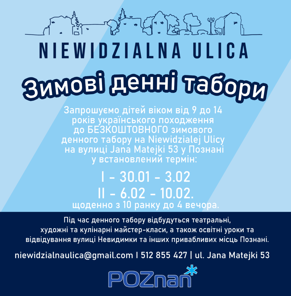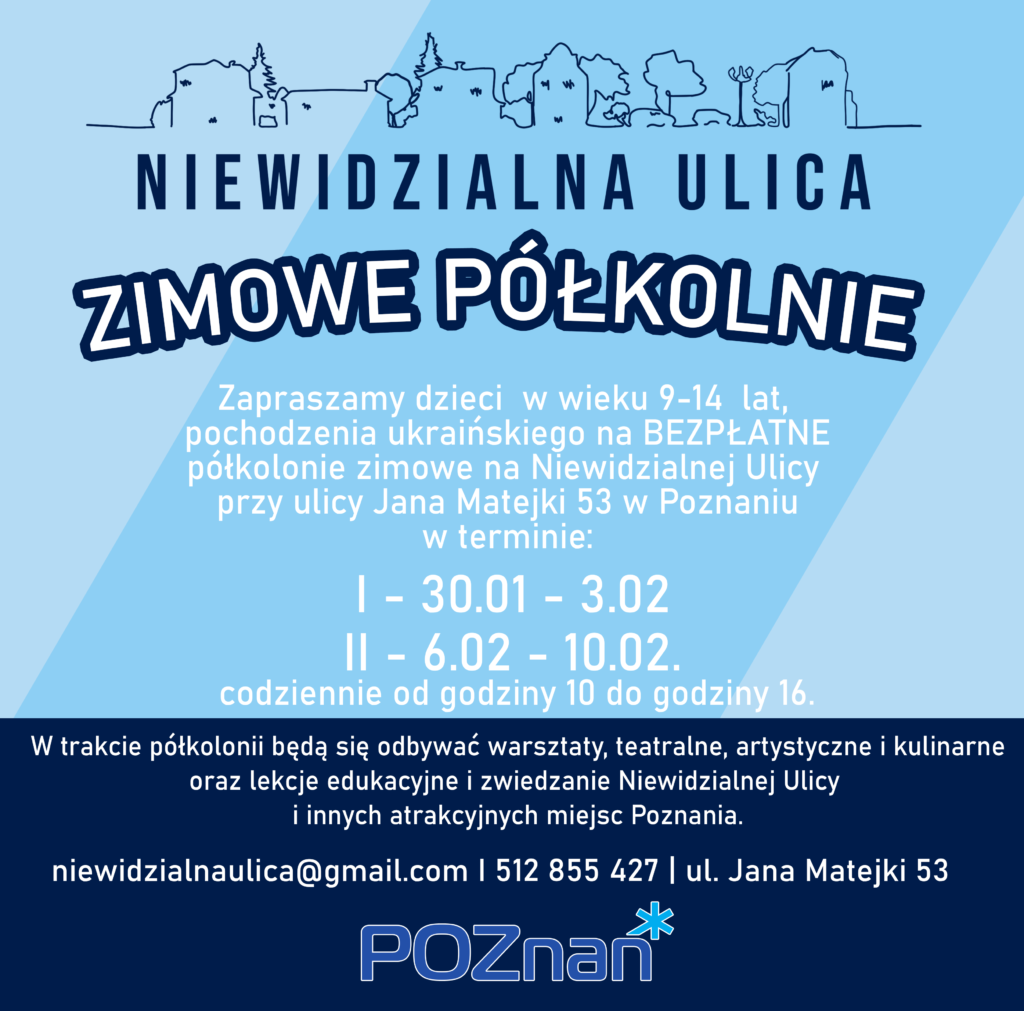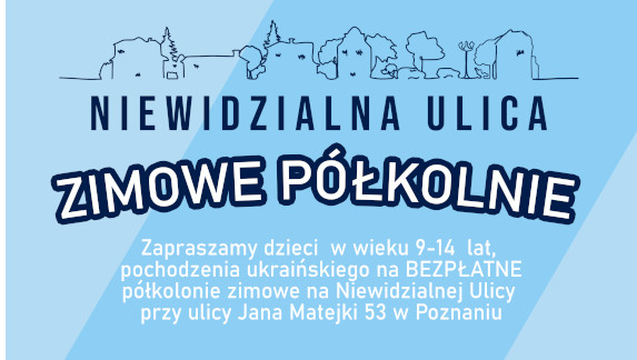 Przekazujemy informacje o bezpłatnych półkoloniach w czasie ferii dla dzieci pochodzenia ukraińskiego na Niewidzialnej Ulicy, organizowanych z Wydziałem Zdrowia Miasta Poznania. na których będą zajęcia teatralne, warsztaty kulinarne i artystyczne.