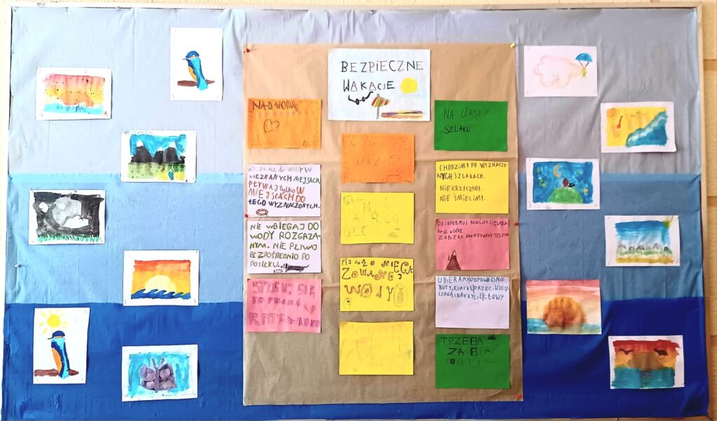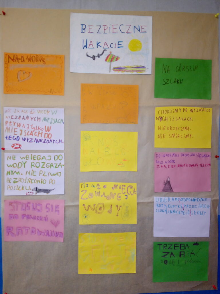 Zbliżający się koniec roku szkolnego był doskonałą okazją do poruszenia tematyki bezpieczeństwa. Rozmawialiśmy o zasadach bezpiecznego zachowania w różnych sytuacjach – nad wodą, w górach, w lesie, podczas podróży i o znaczeniu rozwagi i unikania zagrożeń. Dzieliliśmy się swoimi doświadczeniami, poszerzaliśmy wiedzę o nowe, ważne informacje, odpowiadaliśmy na pytania quizu o bezpiecznych wakacjach oraz wykonaliśmy plakat prezentujący zasady bezpieczeństwa.