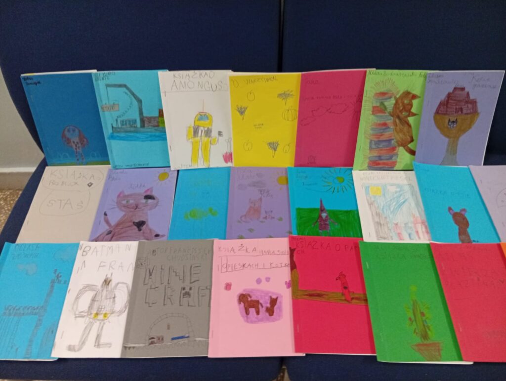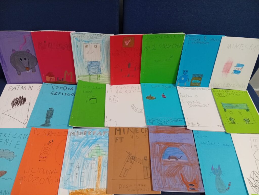 W ramach całorocznej akcji niemal codziennie w wielu grupach świetlicowych odbywały się spotkania z książką. Słuchaliśmy czytanych opowiadań, wierszy i powieści, a także samodzielnie czytaliśmy wybrane utwory, korzystając z biblioteczki świetlicowej. Pierwszoklasiści samodzielnie tworzyli własne książeczki, projektując okładkę, treść i ilustracje. Może ktoś kiedyś stanie się pisarzem😊