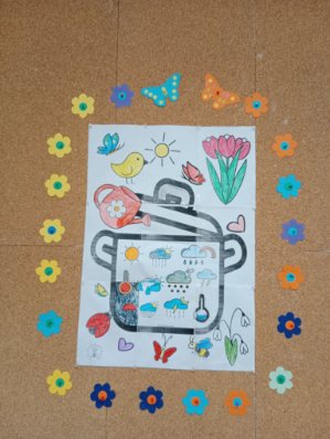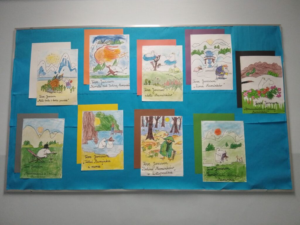 Marzec to kolejny miesiąc, w którym podejmowane były działania w ramach całorocznego projektu opartego o serię książek o uroczych Muminkach i ich przyjaciołach. W tym miesiącu otoczenie domków naszych bohaterów zostało udekorowane wiosennymi elementami, a na tablicy pojawiły się pięknie pokolorowane rysunki okładek wszystkich książek o Muminkach.