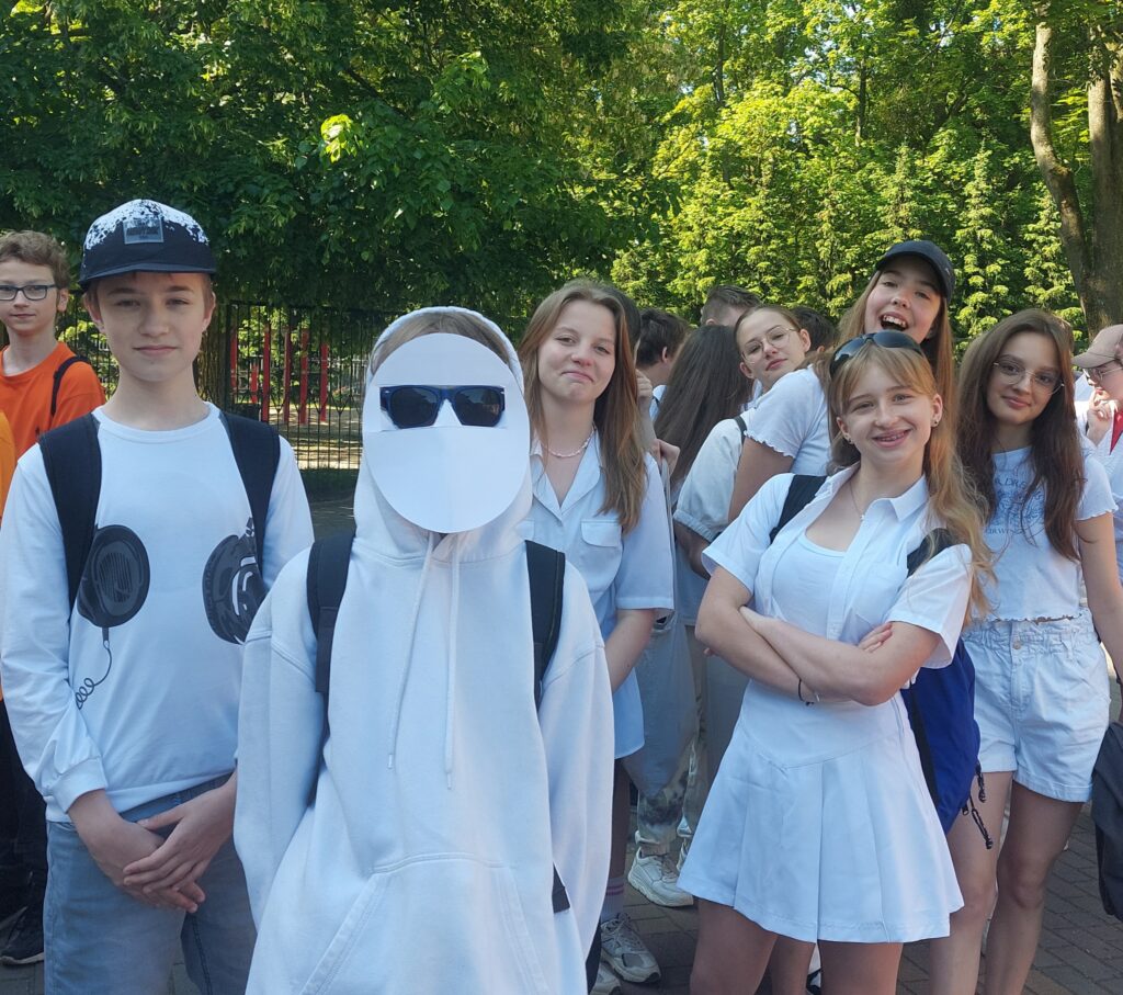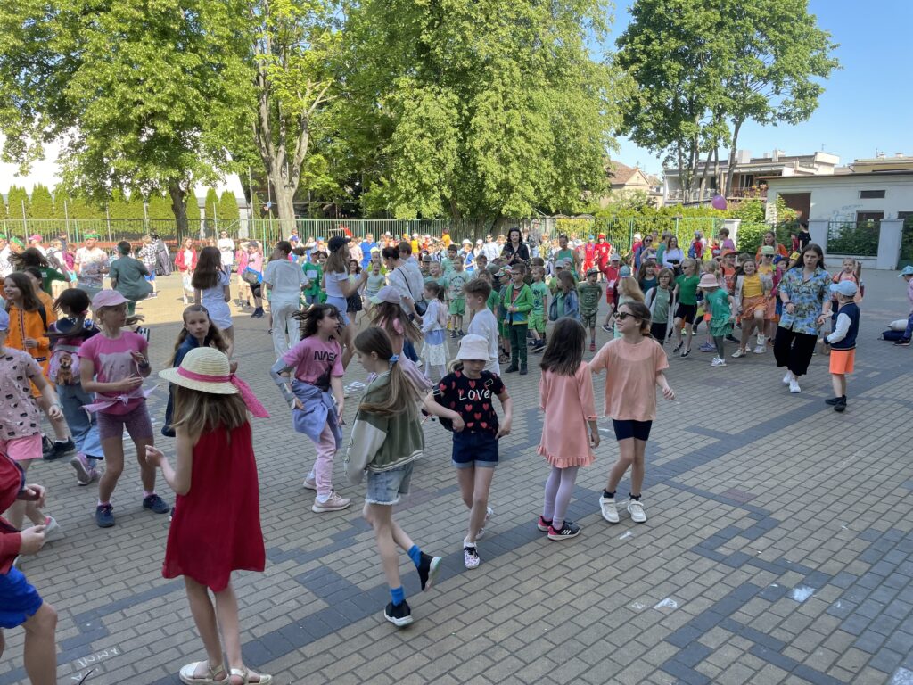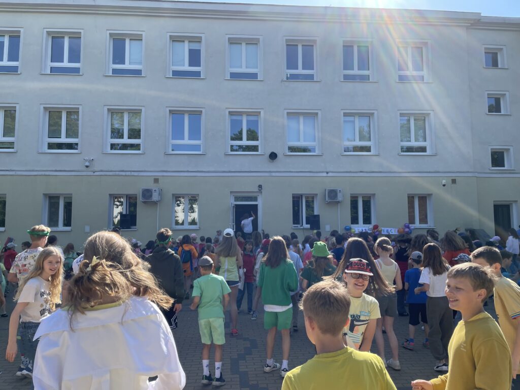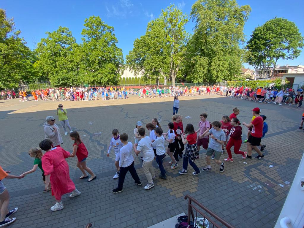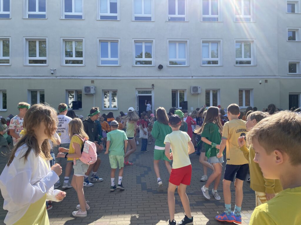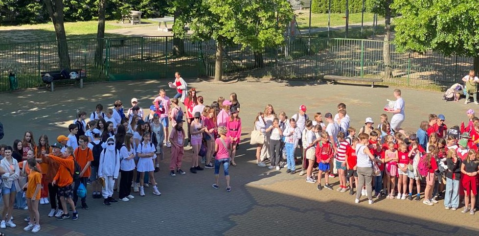 Tego dnia klasy prezentowały ubrania w kolorach, które wcześniej wylosowali dla nich przewodniczący. Widok był niesamowity. Zabawę rozpoczęliśmy już na boisku wspólnymi tańcami. Później kolorowy korowód składający się ze wszystkich nauczycieli i uczniów naszej szkoły przeszedł na Cytadelę na wspólny piknik.