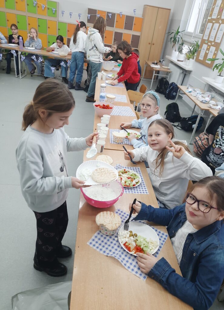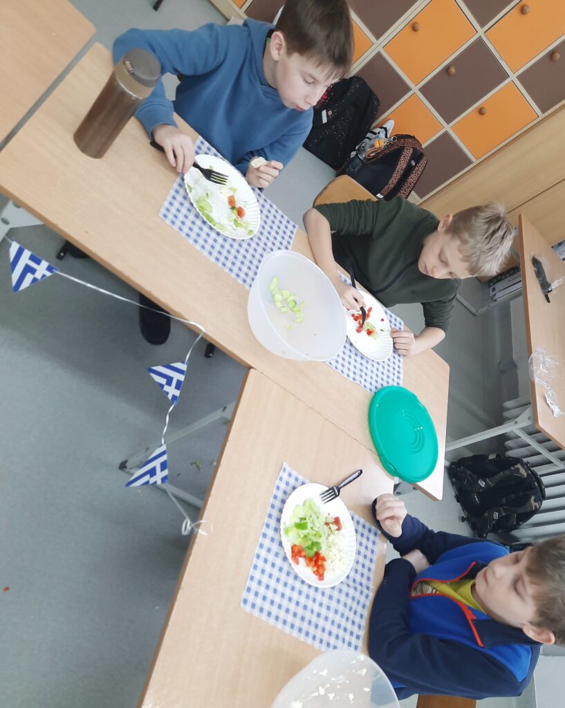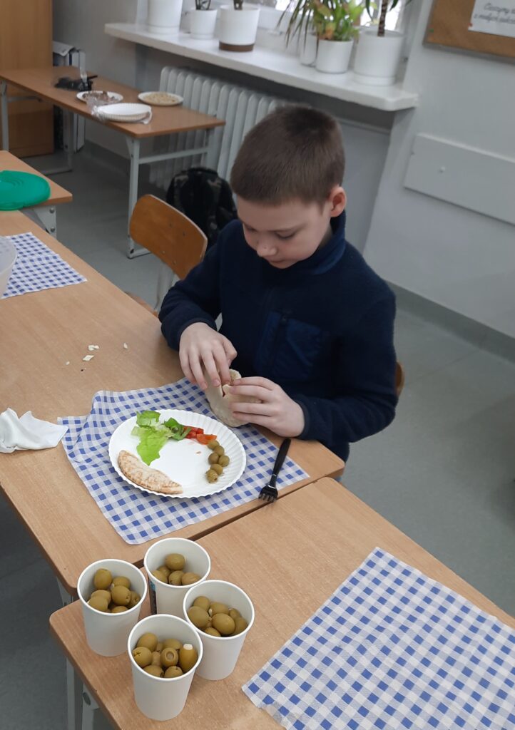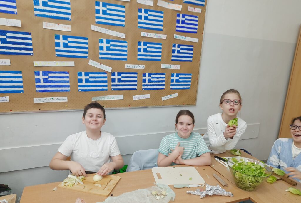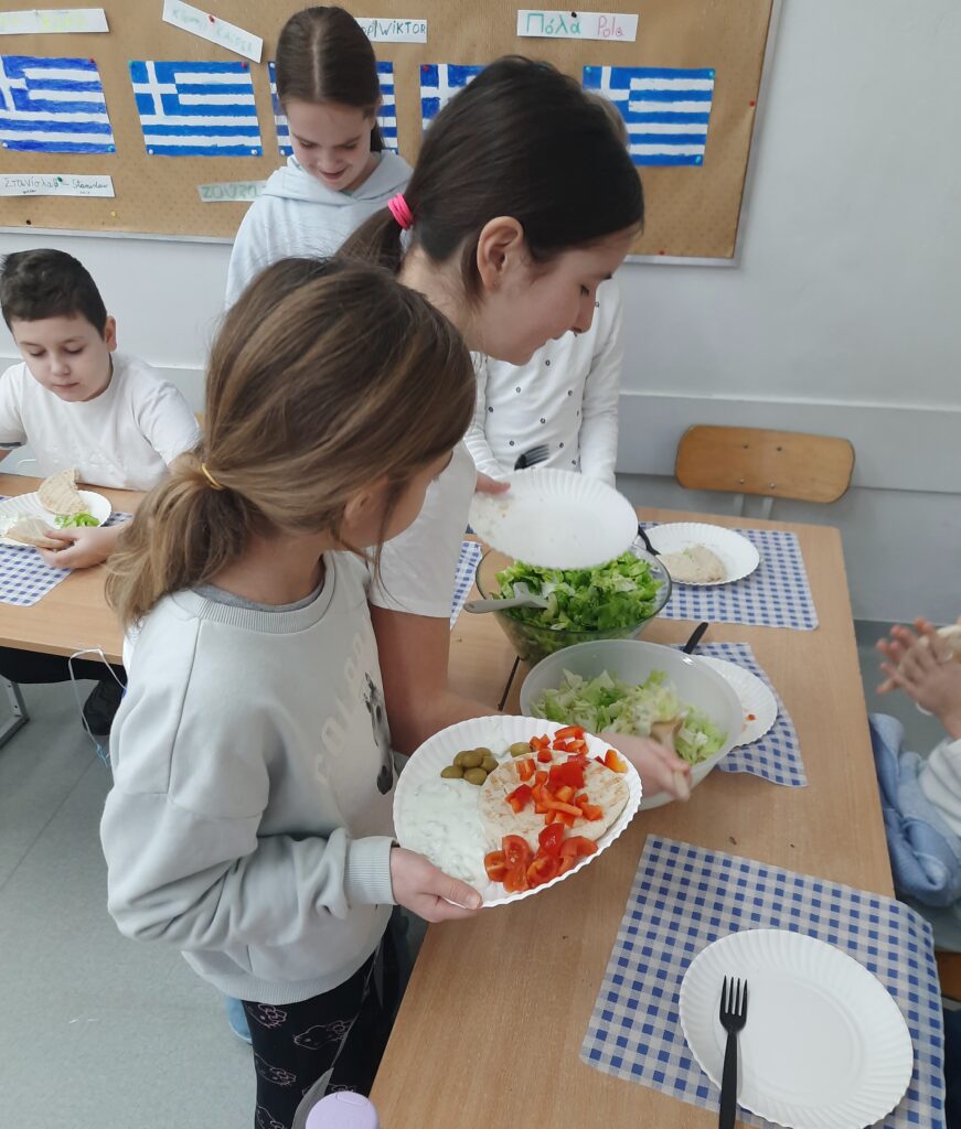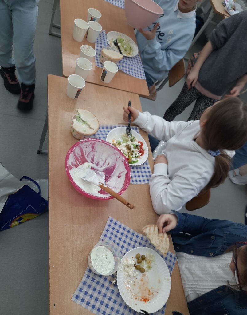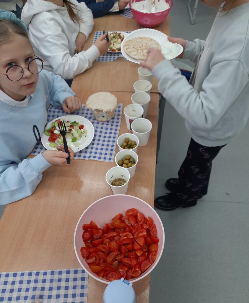 Zwieńczeniem działań była prawdziwa uczta w stylu śródziemnomorskim. Uczniowie wspólnie przygotowali sałatkę grecką oraz sos tzatziki, a Pani Dominika serwowała na ciepło chlebki pita.