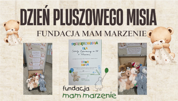 Z całego serca dziękujemy wszystkim uczniom, rodzicom i nauczycielom, którzy włączyli się w zbiórkę pluszaków i zabawek dla chorych dzieci przebywających w szpitalu, zorganizowaną z okazji Dnia Pluszowego Misia, pod patronatem Fundacji Mam Marzenie.