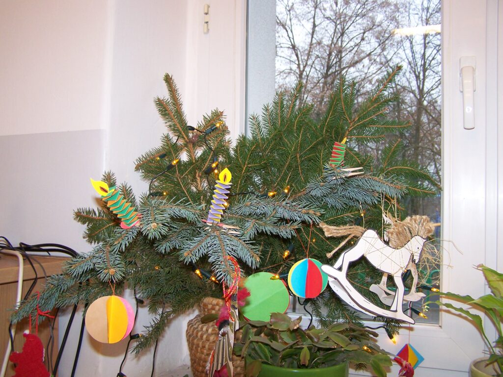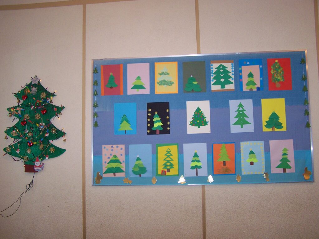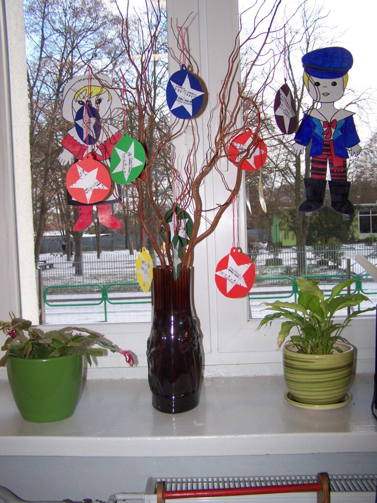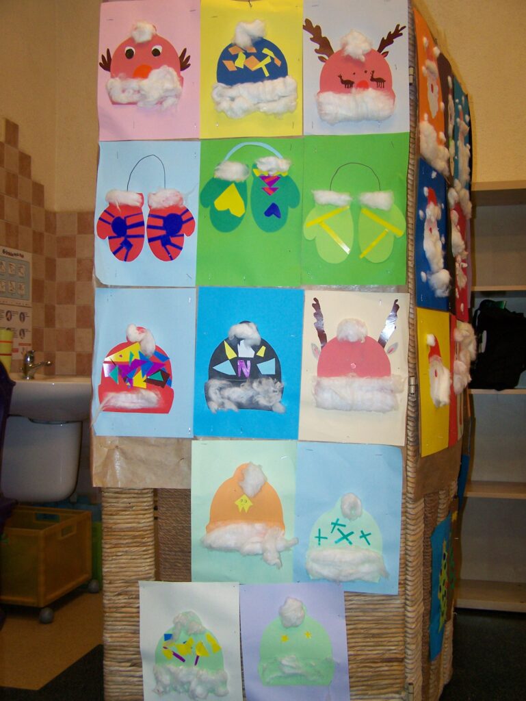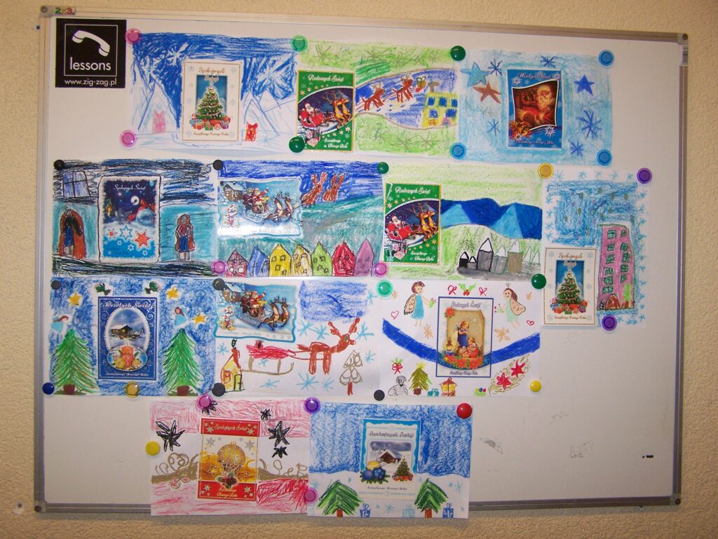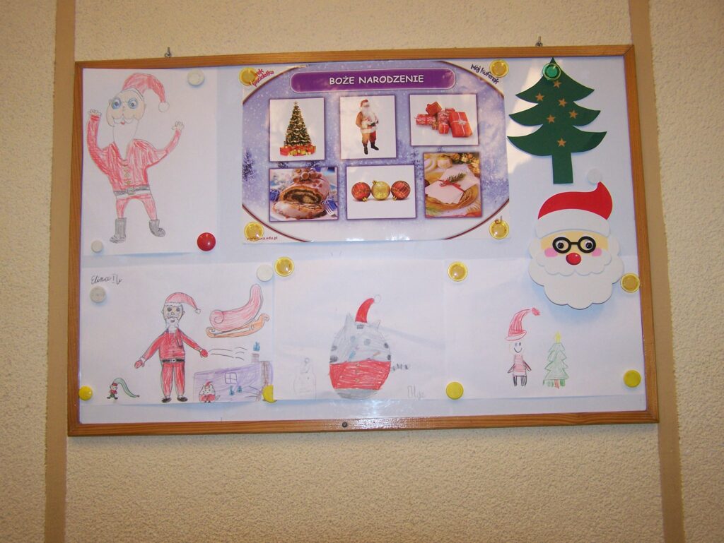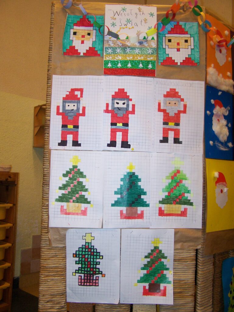 Z początkiem grudnia rozpoczęliśmy intensywne przygotowania do świąt. Niemal każdego dnia pojawiały się propozycje tworzenia różnorodnych form dekoracji, prac plastycznych oraz kartek świątecznych. Codziennie przybywały nowe, które upiększały wszystkie możliwe miejsca w naszych salach. Oprócz działań plastyczno-technicznych śpiewaliśmy pastorałki i kolędy, czytaliśmy opowiadania i fragmenty książek o tematyce świątecznej, poznawaliśmy zwyczaje bożonarodzeniowe innych narodów, rozwiązywaliśmy łamigłówki, quizy, zagadki i krzyżówki dotyczące naszych tradycji, zwłaszcza tych wigilijnych, a przy okazji mówiliśmy o zasadach dobrego zachowania się przy stole.