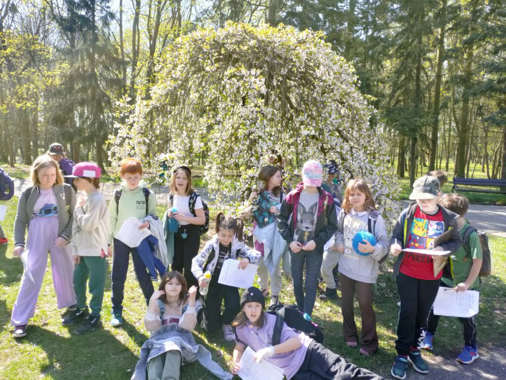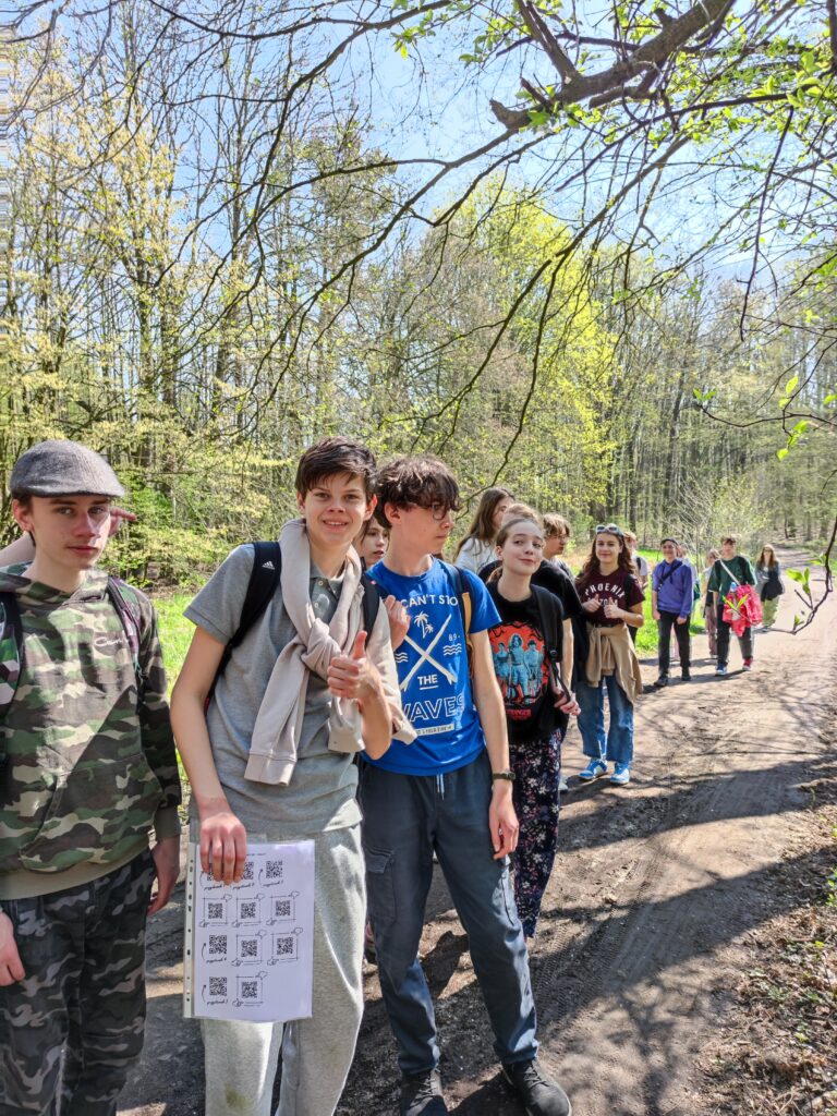 Uczniowie wraz z nauczycielami zaopatrzeni w mapy wędrowali po wytyczonych trasach, poznając różne ciekawostki zarówno ze świata przyrody, jak i z historii naszego miasta. Pogoda dopisała, humory również… 😊