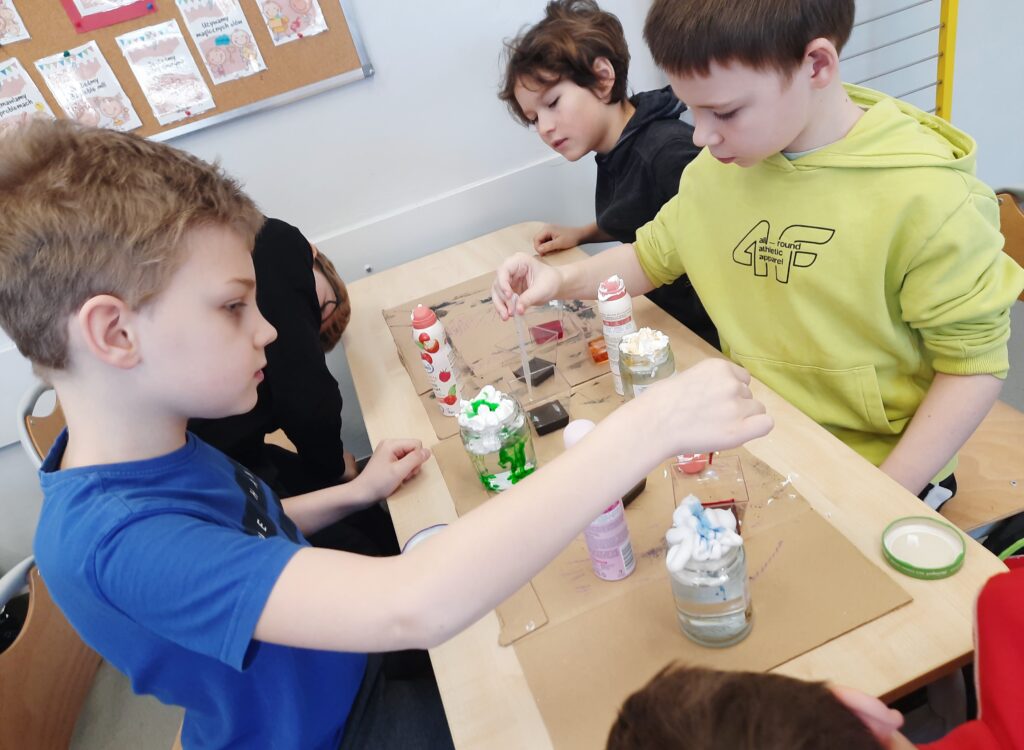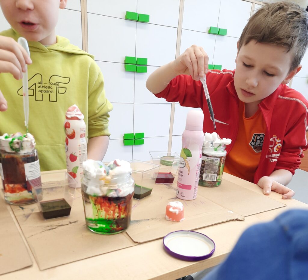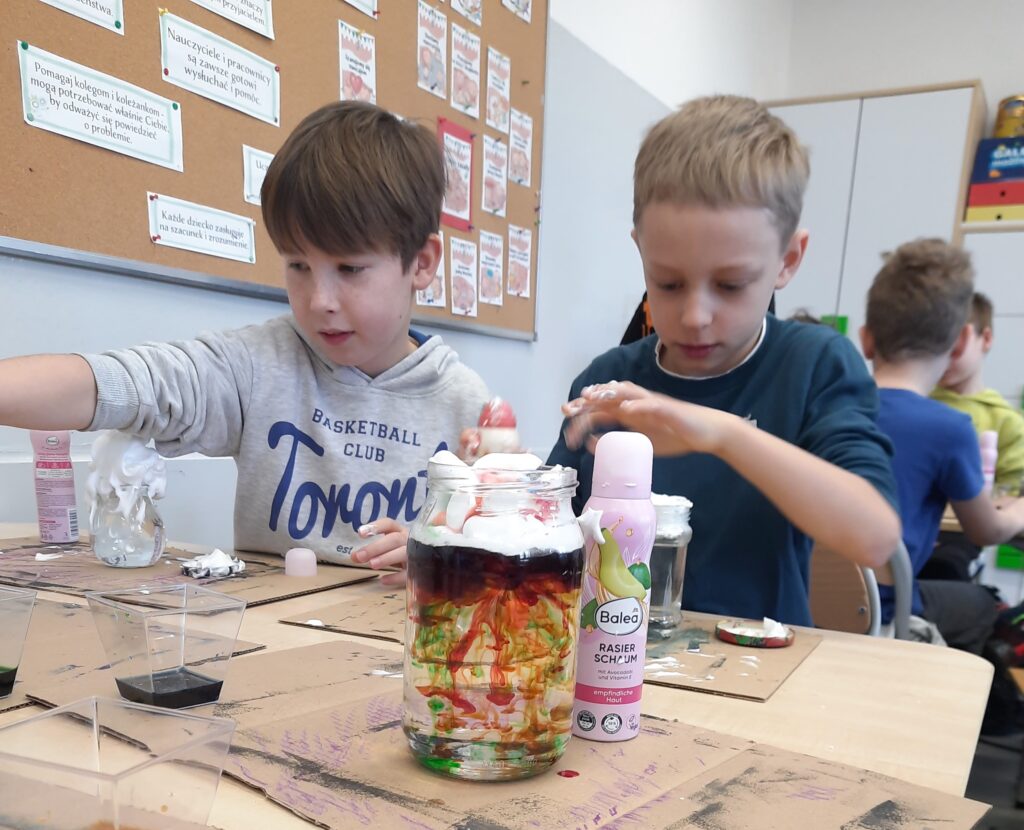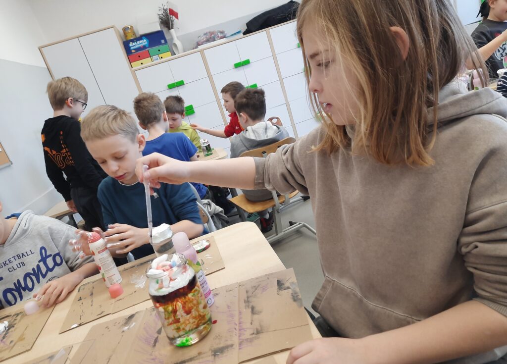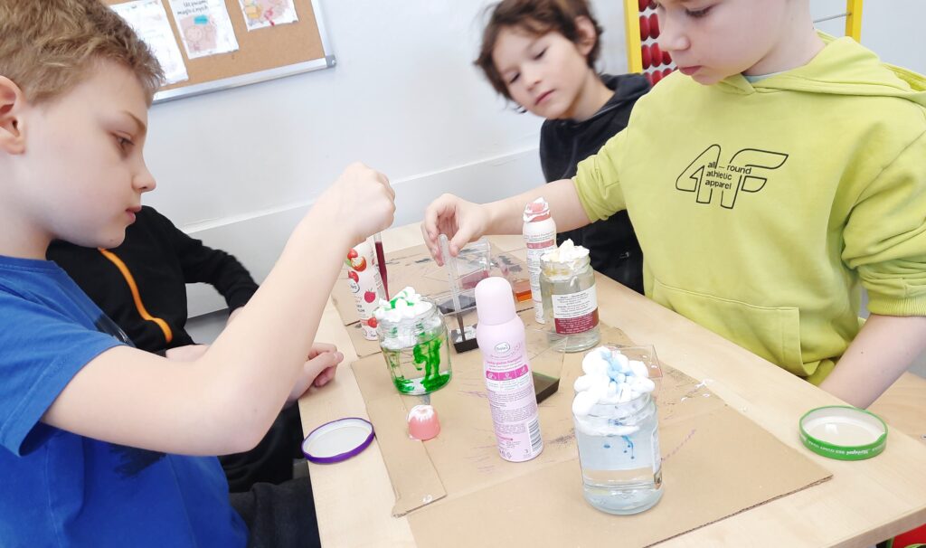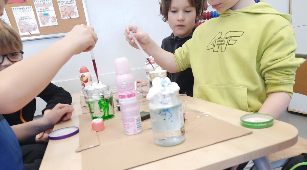 Czy piankowa chmurka na wodzie może stworzyć deszcz? Dlaczego pianka unosi się na powierzchni i nie tonie? Czy kolorowe barwniki spożywcze przenikną do wody? Na te pytania odpowiadali uczniowie klasy 2c analizując połączenie wody w słoiku, pianki do golenia oraz barwników: