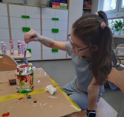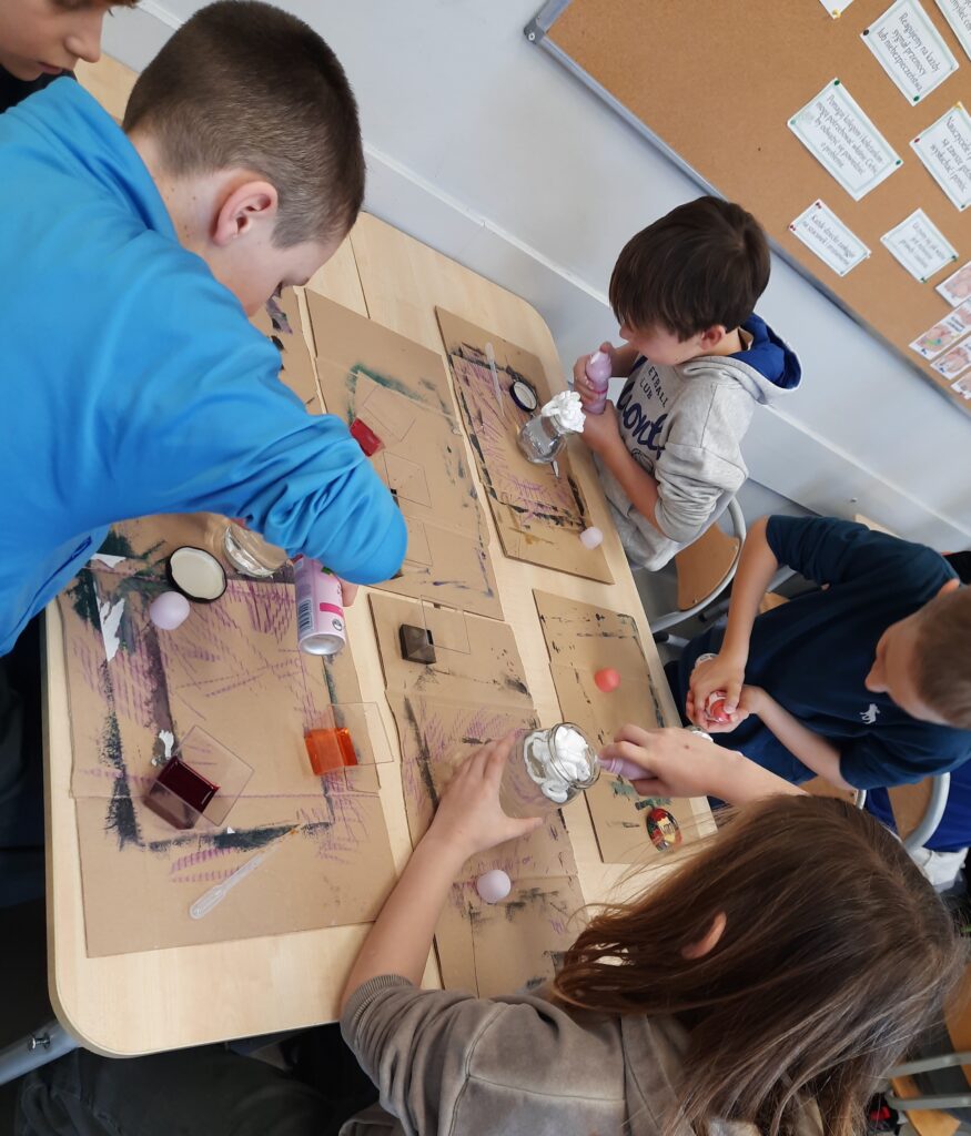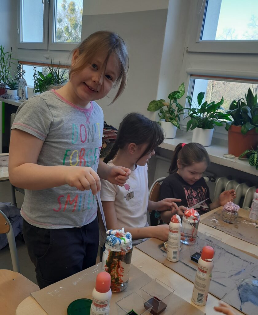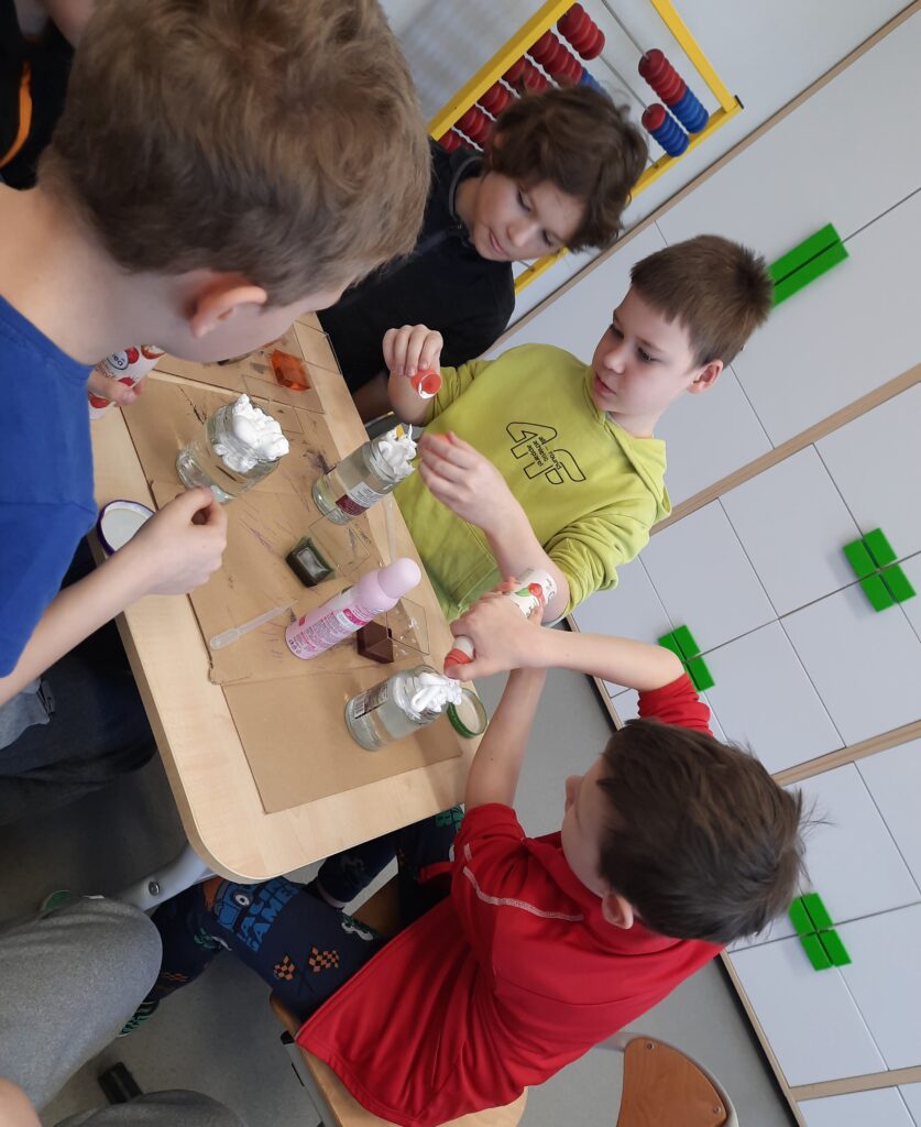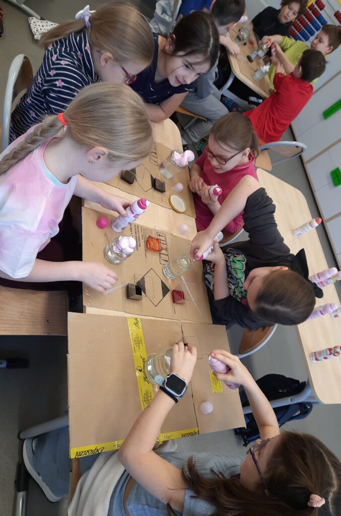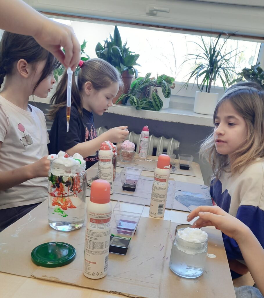Czy piankowa chmurka na wodzie może stworzyć deszcz? Dlaczego pianka unosi się na powierzchni i nie tonie? Czy kolorowe barwniki spożywcze przenikną do wody? Na te pytania odpowiadali uczniowie klasy 2c analizując połączenie wody w słoiku, pianki do golenia oraz barwników: