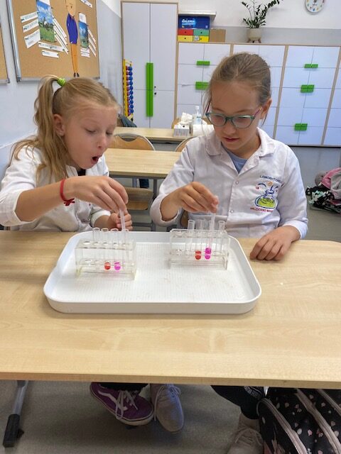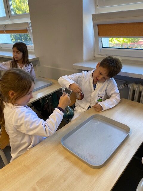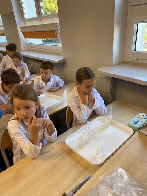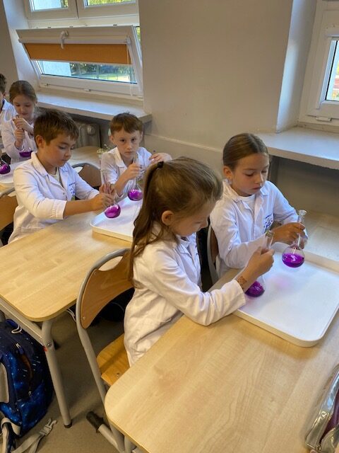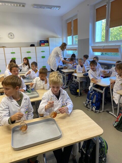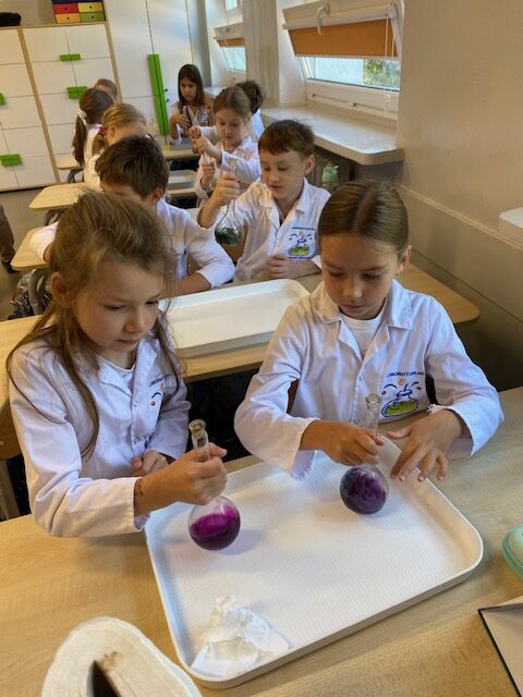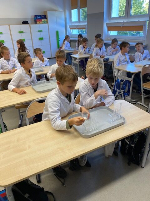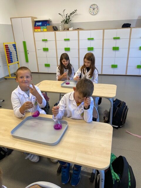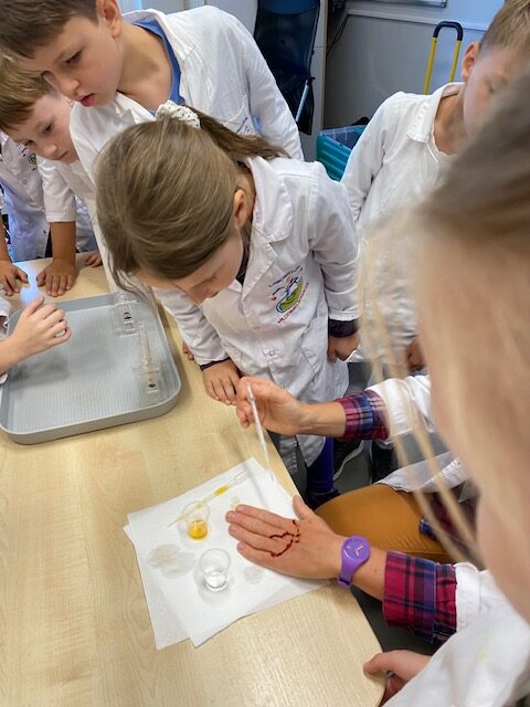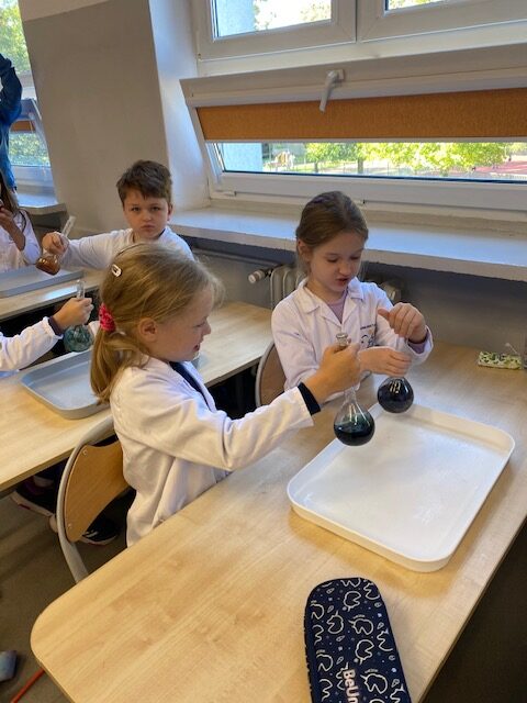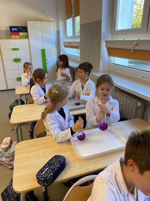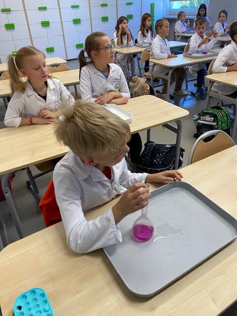 25 września 2025 r. uczniowie klasy 2 b wcielili się w prawdziwych naukowców. Przeprowadzili eksperyment pod hasłem – Kolory jak Kameleon. Podczas doświadczeń poznali barwy podstawowe, zobaczyli jak powstają barwy pochodne, jak zmieniają się kolory pod wpływem różnych odczynników. Ogromne wrażenie wywołało w uczniach uzyskanie z mieszaniny odczynników sztucznej krwi i wykorzystania jej w produkcjach teatralnych i filmowych.