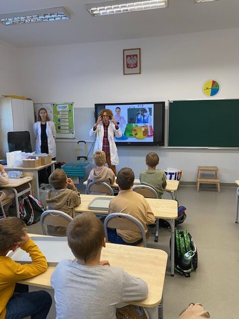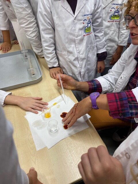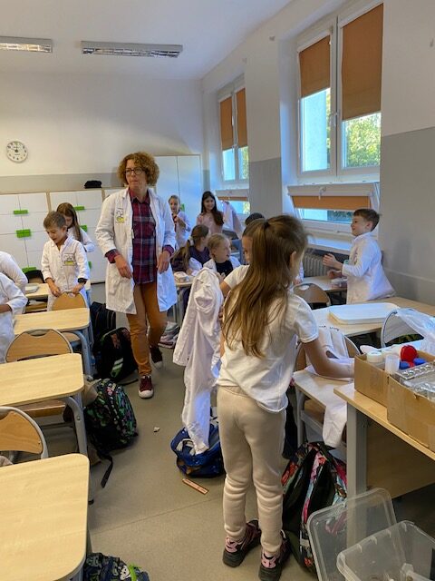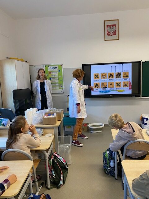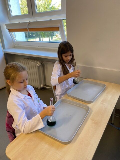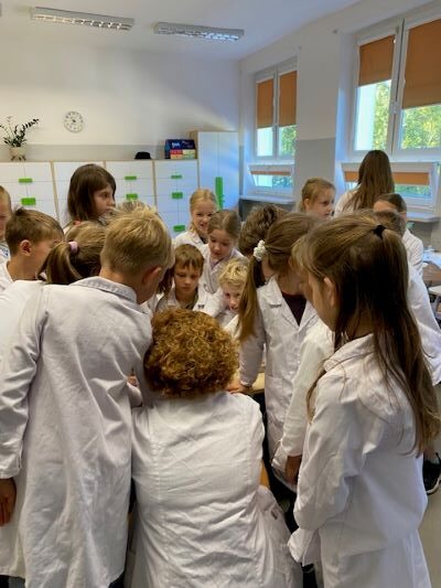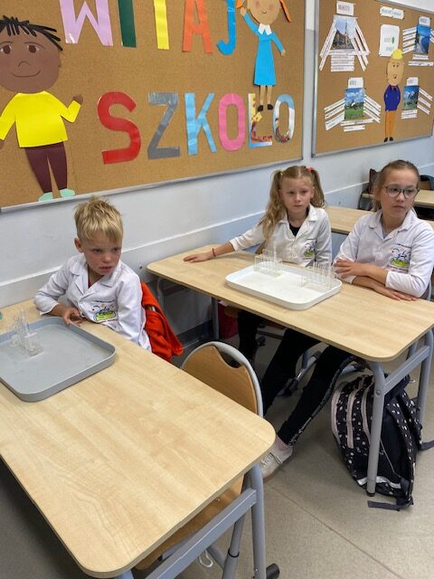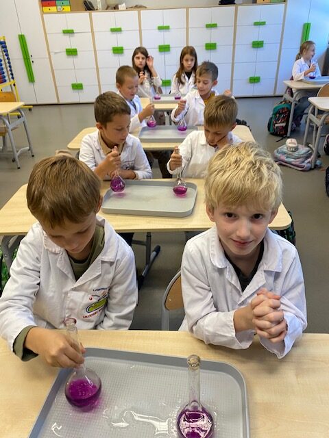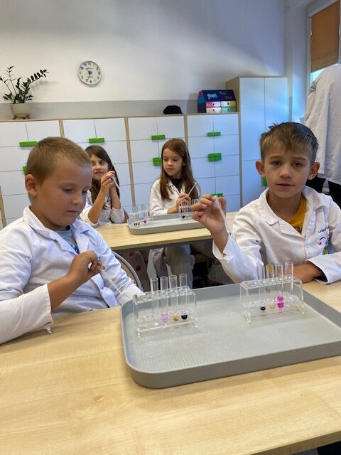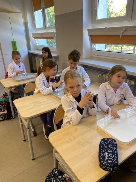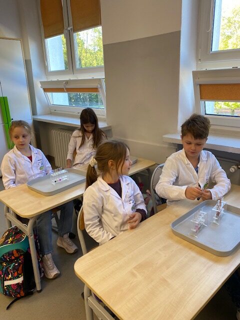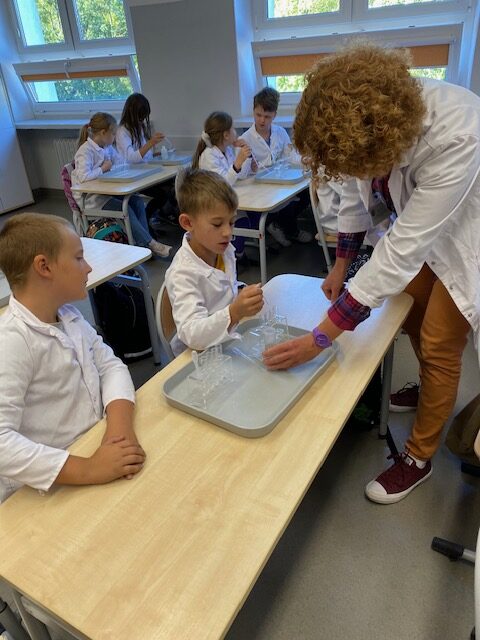 25 września 2025 r. uczniowie klasy 2 b wcielili się w prawdziwych naukowców. Przeprowadzili eksperyment pod hasłem – Kolory jak Kameleon. Podczas doświadczeń poznali barwy podstawowe, zobaczyli jak powstają barwy pochodne, jak zmieniają się kolory pod wpływem różnych odczynników. Ogromne wrażenie wywołało w uczniach uzyskanie z mieszaniny odczynników sztucznej krwi i wykorzystania jej w produkcjach teatralnych i filmowych.