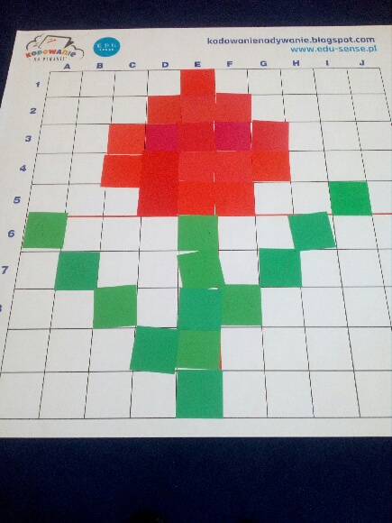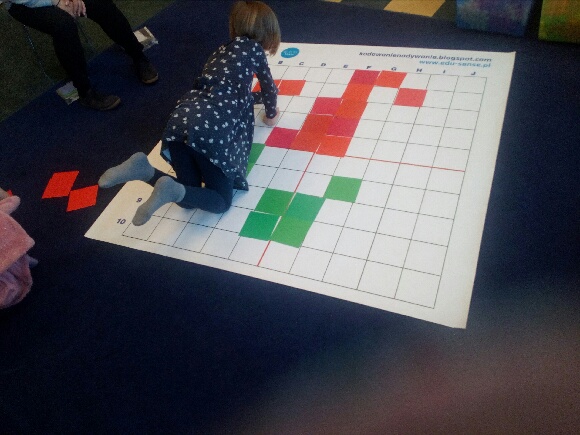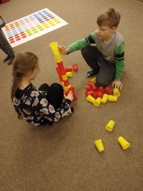 Jeden tydzień marca poświęciliśmy na cykl zajęć wypełniony zabawami z kodowania. Wśród wykonywanych przez nas zadań znalazły się działania z kolorowymi kubeczkami, kubeczkowe sudoku, labirynty, gry planszowe na macie edukacyjnej, szyfrowanie według kodu, kodowanie ćwiczeń gimnastycznych i piosenek, szukanie różnic między obrazkami, dyktanda graficzne oraz zabawy z chustą animacyjną.