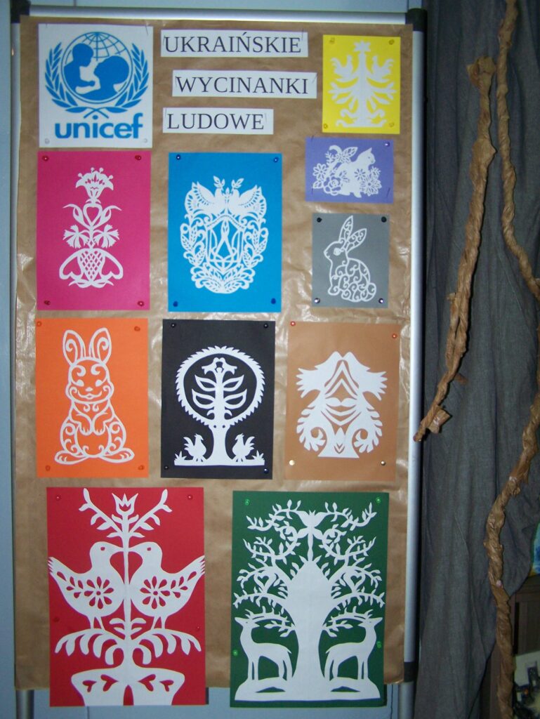 – uczestnicząc w warsztatach pod patronatem UNICEF Kodowanie na dywanie – ludowe hafty ukraińskie, wykonaliśmy przepiękne wycinanki, które zostały zamieszczone na wystawie w holu szkoły;