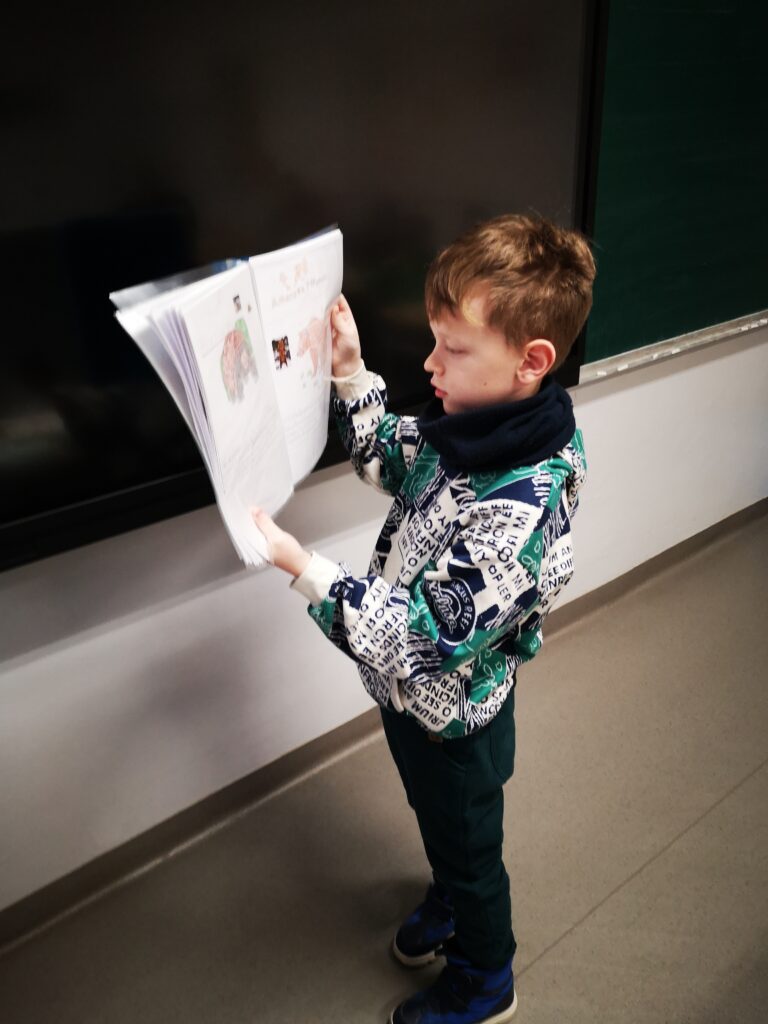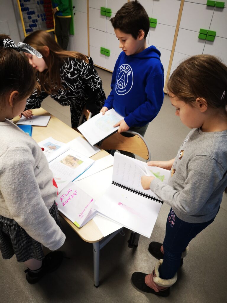 Mali odkrywcy klasy 2c poprzez stworzenie własnego Atlasu Zwierząt zdobywali wiedzę o najliczniejszej i najbardziej zróżnicowanej grupie organizmów na Ziemi, jaką są zwierzęta. Zgłębiali tajemnice egzotyki najciekawszych gatunków z każdego  kontynentu świata, ich wygląd, zachowanie, sposób życia. Czy wiecie, że pszczoły potrafią tańczyć? Podczas prezentacji uczniowie przedstawiali ciekawostki o wybranych zwierzętach.  Mali odkrywcy, zafascynowani zgromadzonymi informacjami, mówili o pragnieniu zaobserwowania zwierząt w ich naturalnych warunkach życia oraz wykazali się wrażliwością w kwestii ochrony zagrożonych gatunków.