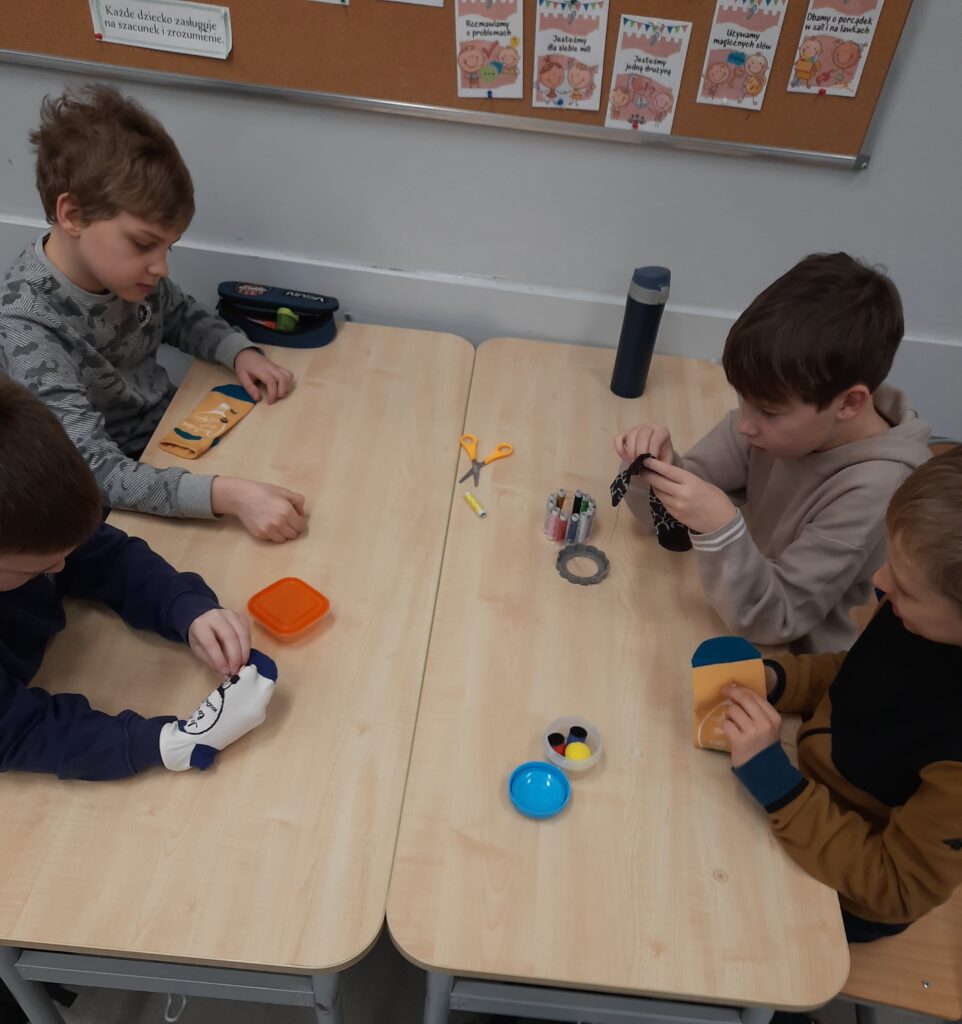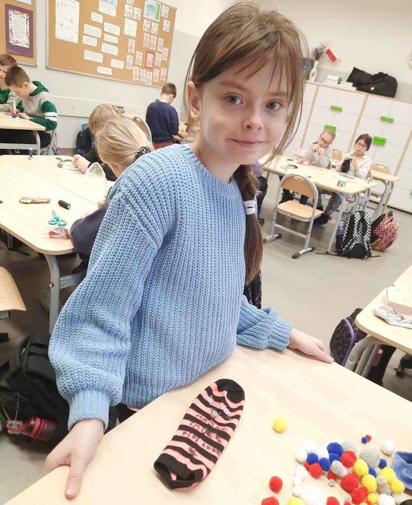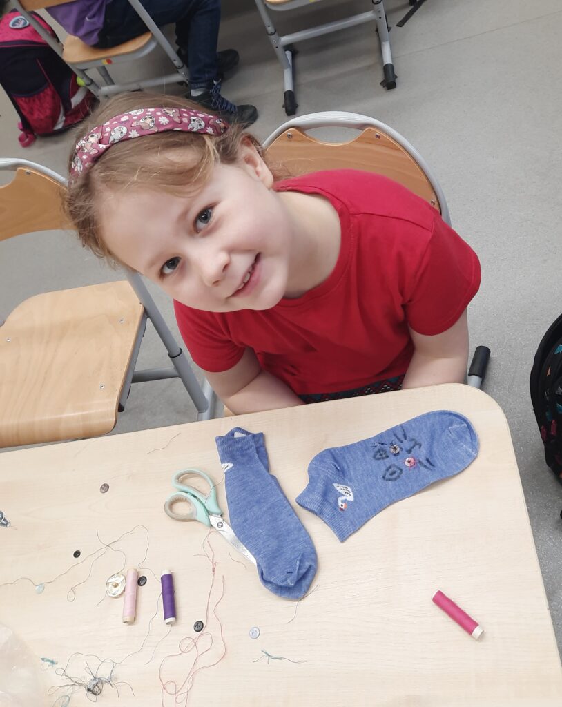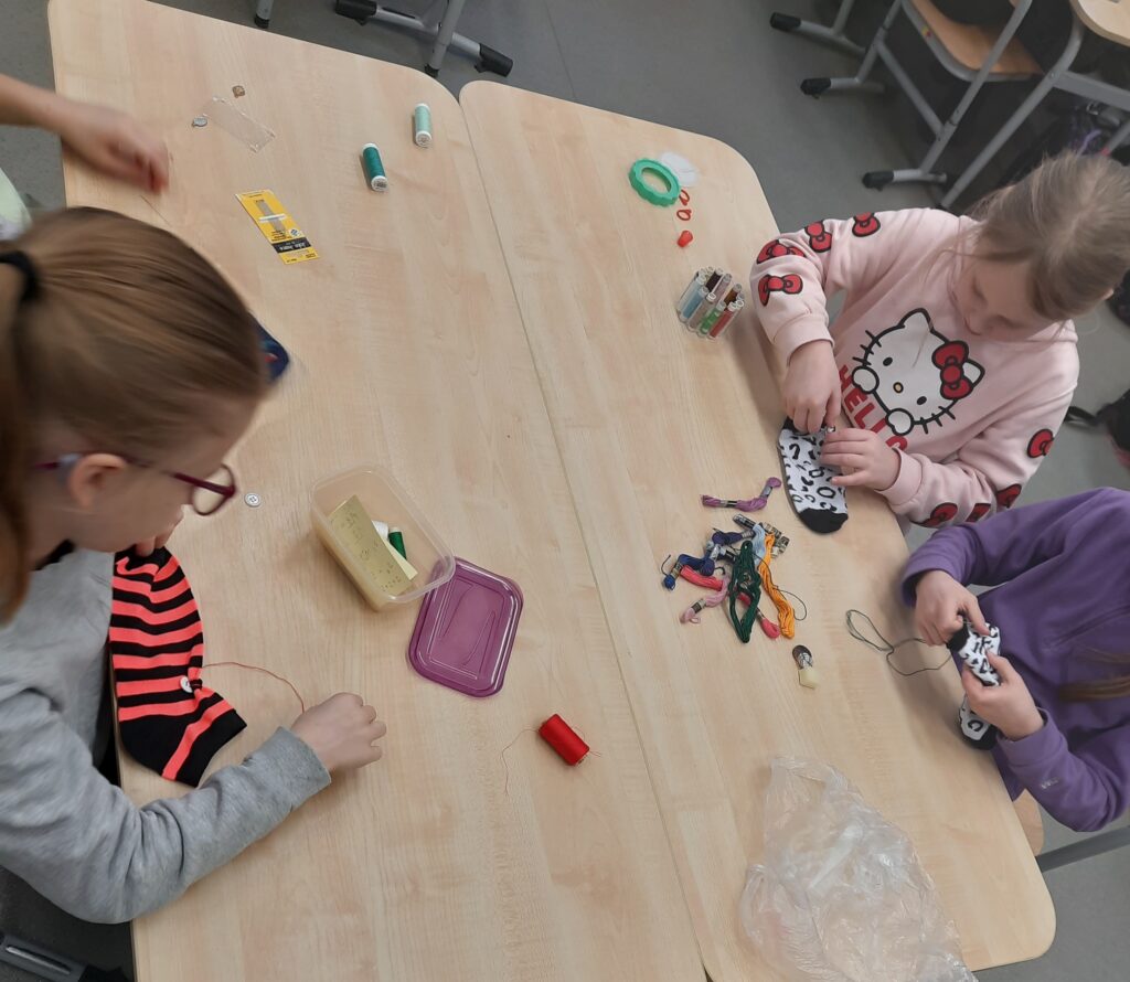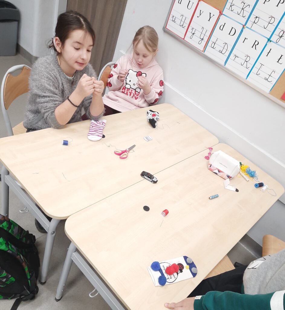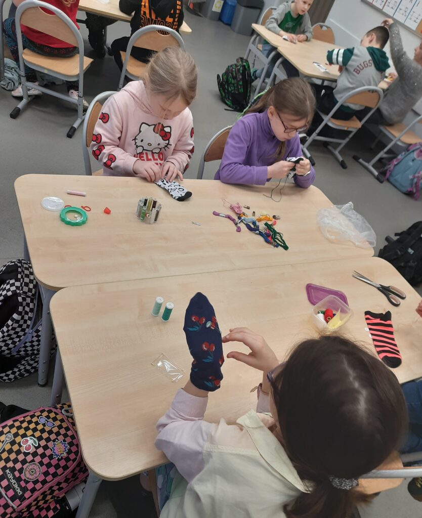 Czy omawianie lektur można ograniczyć tylko do zadań pisemnych? W klasie 2c zdecydowanie nie. Rozmawiając o lekturze ,,Zaczarowana zagroda” uczniowie tworzyli sztuczny śnieg i śnieżną zagrodę pingwinów. W lutym przyszedł czas na ,,Niesamowite przygody dziesięciu skarpetek”. Książka wszystkim przypadła do gustu. Zwieńczenie było projektowanie i ozdabianie własnej skarpetki. Można było ją przyozdobić pomponikami, pisakami i przede wszystkim doszyć guziki. Umiejętność, która bardzo przydaje się w życiu, uczniowie opanowali bez problemu.