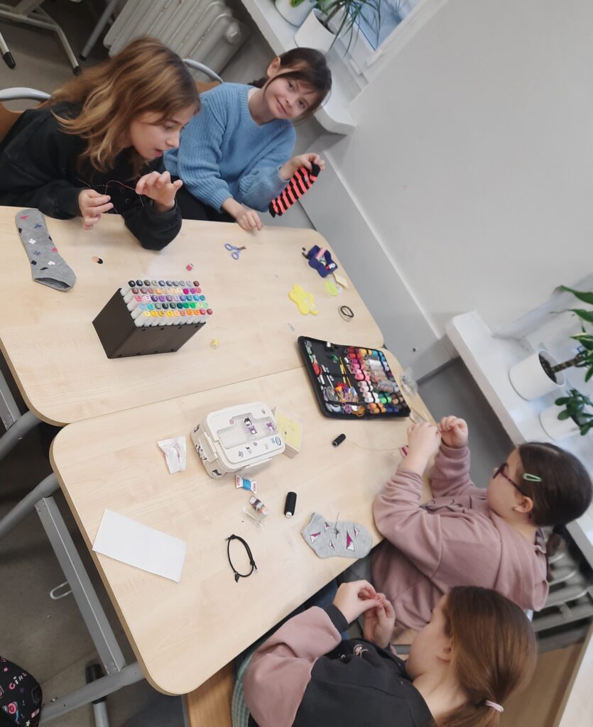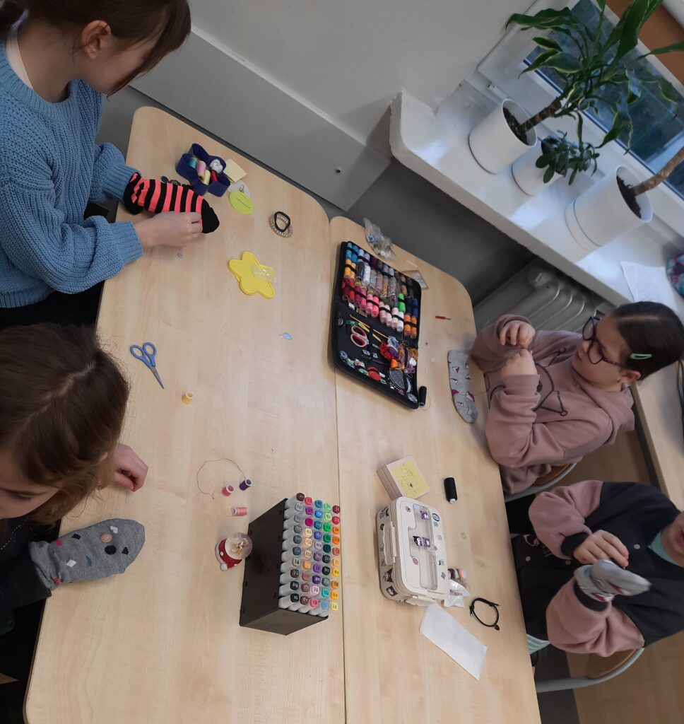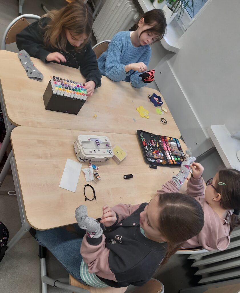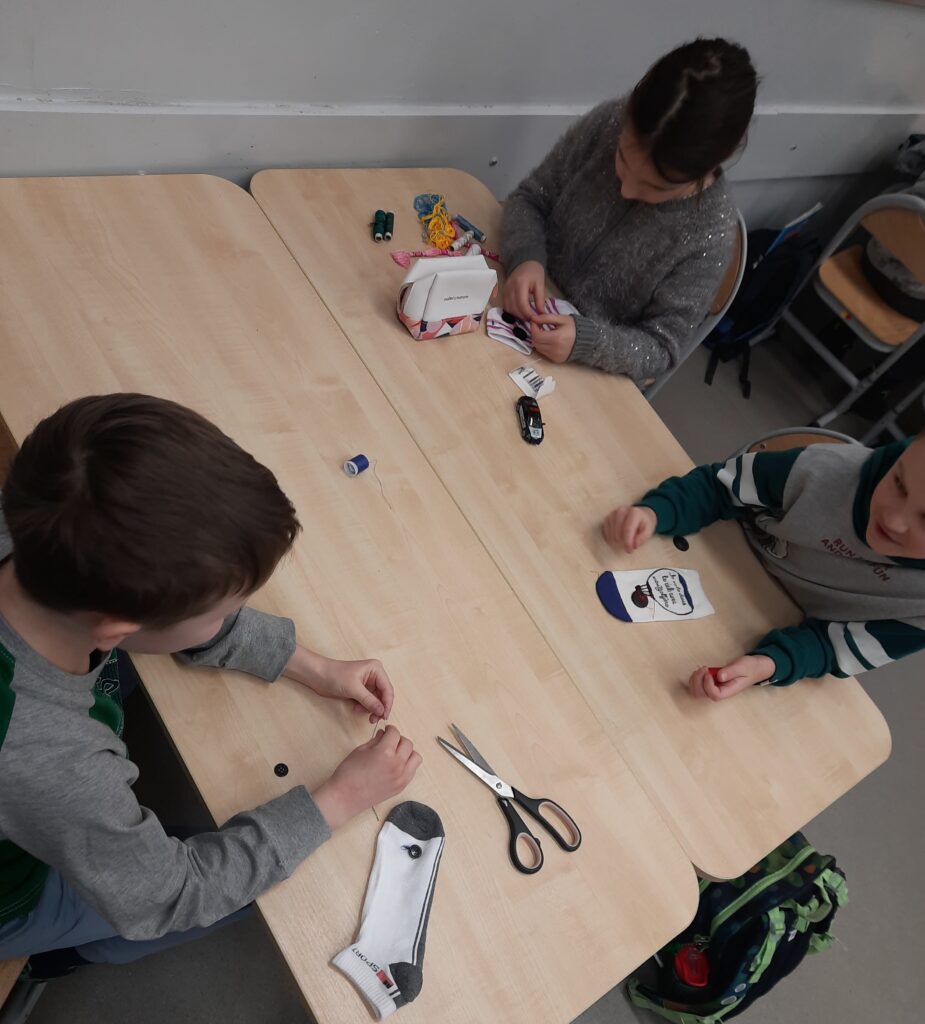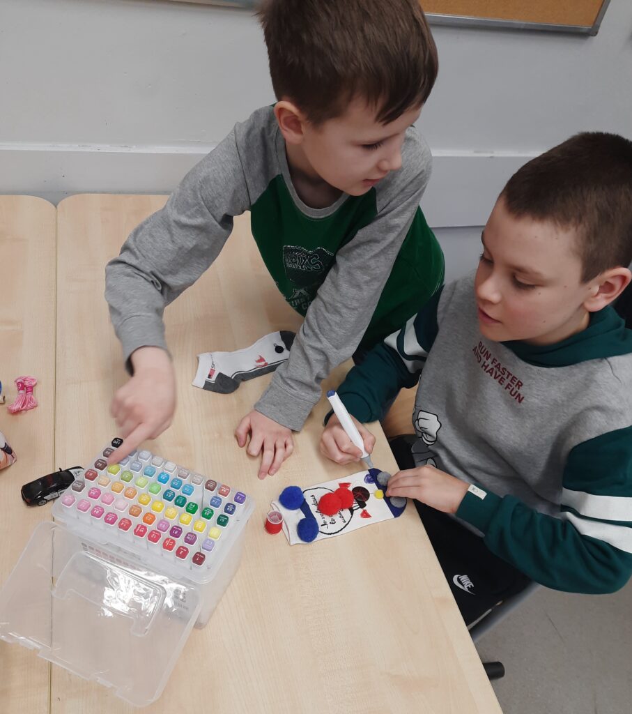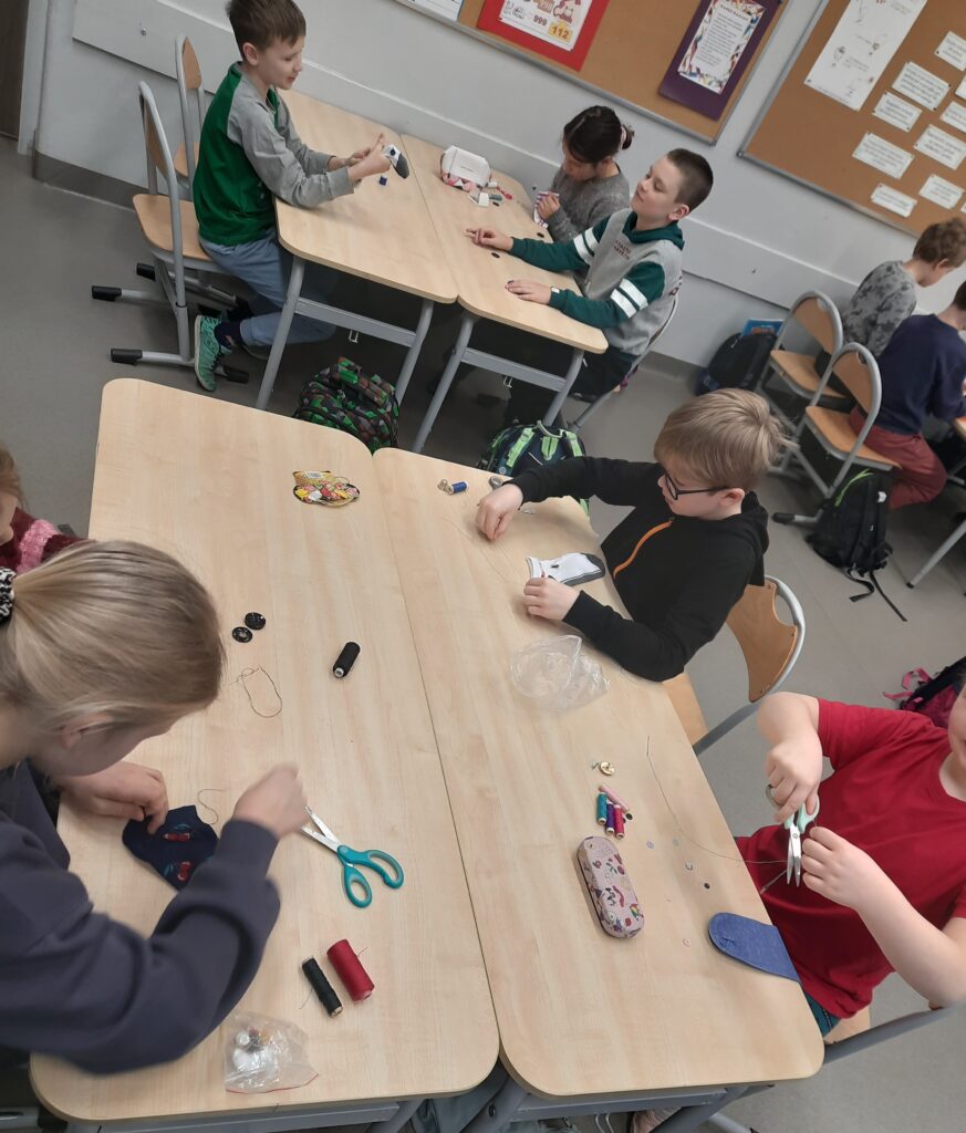Czy omawianie lektur można ograniczyć tylko do zadań pisemnych? W klasie 2c zdecydowanie nie. Rozmawiając o lekturze ,,Zaczarowana zagroda” uczniowie tworzyli sztuczny śnieg i śnieżną zagrodę pingwinów. W lutym przyszedł czas na ,,Niesamowite przygody dziesięciu skarpetek”. Książka wszystkim przypadła do gustu. Zwieńczenie było projektowanie i ozdabianie własnej skarpetki. Można było ją przyozdobić pomponikami, pisakami i przede wszystkim doszyć guziki. Umiejętność, która bardzo przydaje się w życiu, uczniowie opanowali bez problemu.
