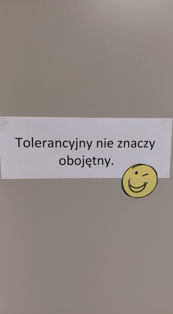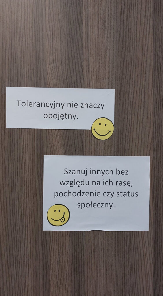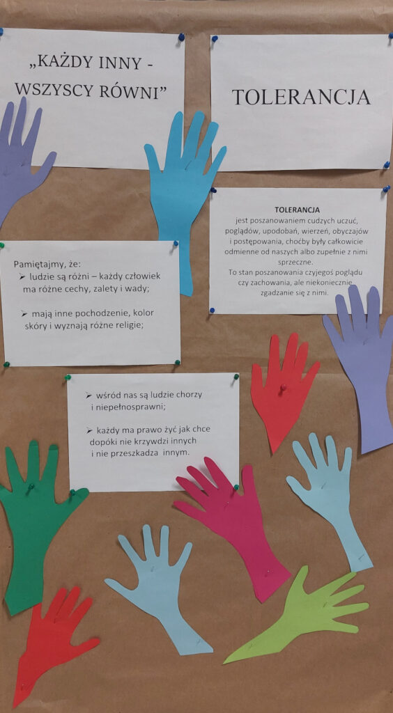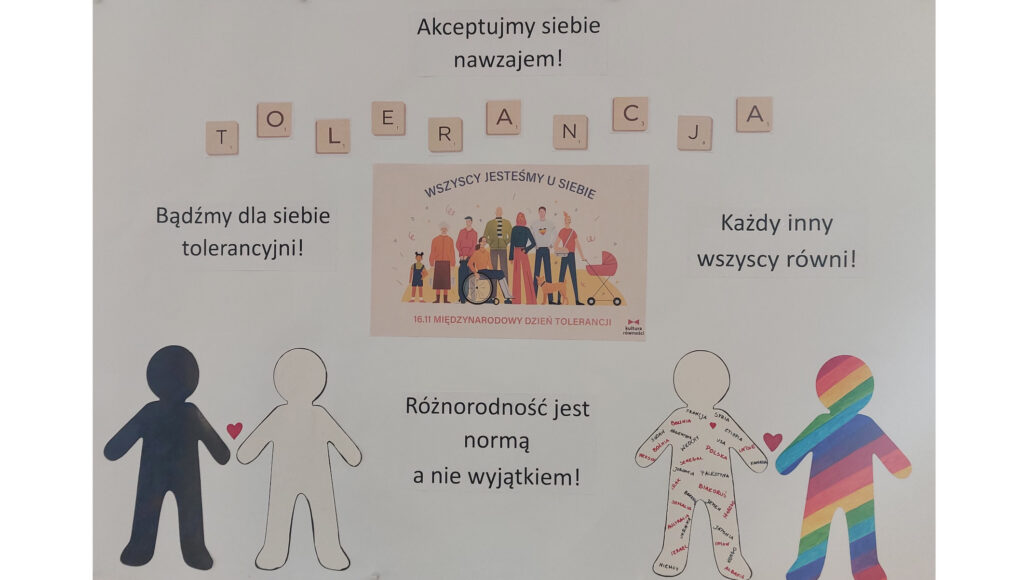 „Tolerancja to szacunek, akceptacja i uznanie bogactwa różnorodności kultur na świecie, naszych form wyrazu i sposobów na bycie człowiekiem. Sprzyja jej wiedza, otwartość, komunikowanie się oraz wolność słowa, sumienia i wiary. Tolerancja jest harmonią w różnorodności. To nie tylko moralny obowiązek, ale także prawny i polityczny warunek. Tolerancja – wartość, która czyni możliwym pokój – przyczynia się do zastąpienia kultury wojny kulturą pokoju” – tymi słowami zaczyna się Deklaracja na temat Zasad Tolerancji, której rocznicę przyjęcia (16 listopada 1995) obchodzimy każdego roku w naszej szkole.