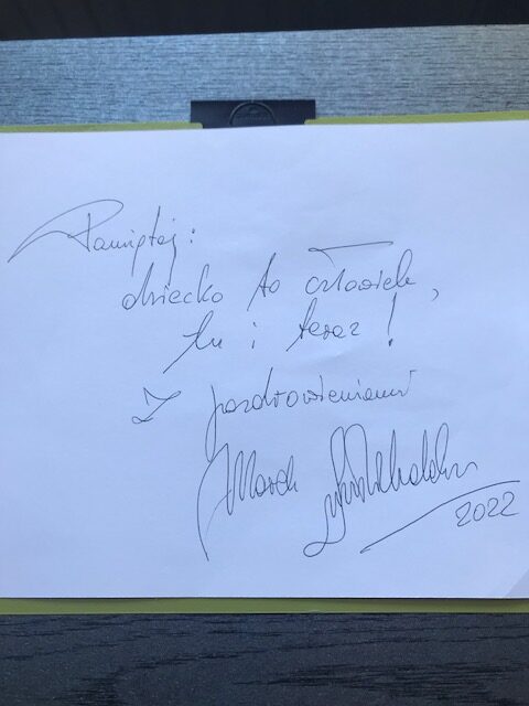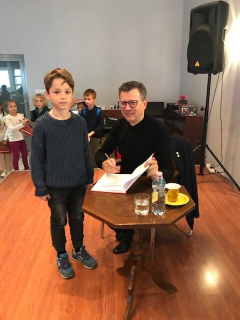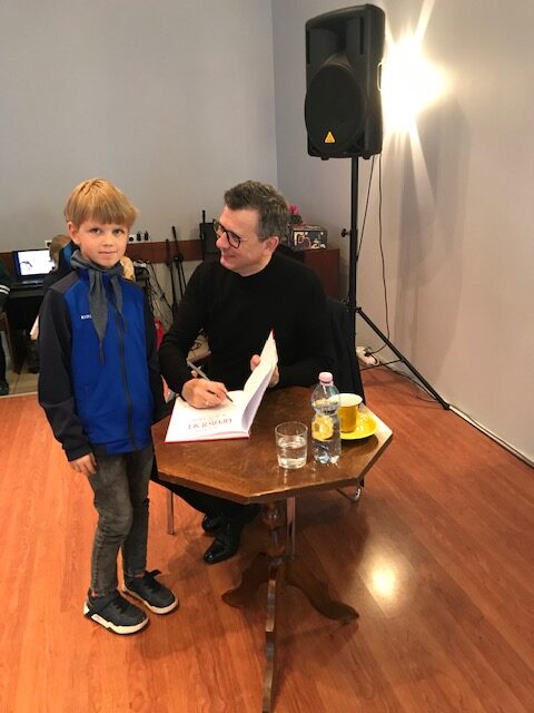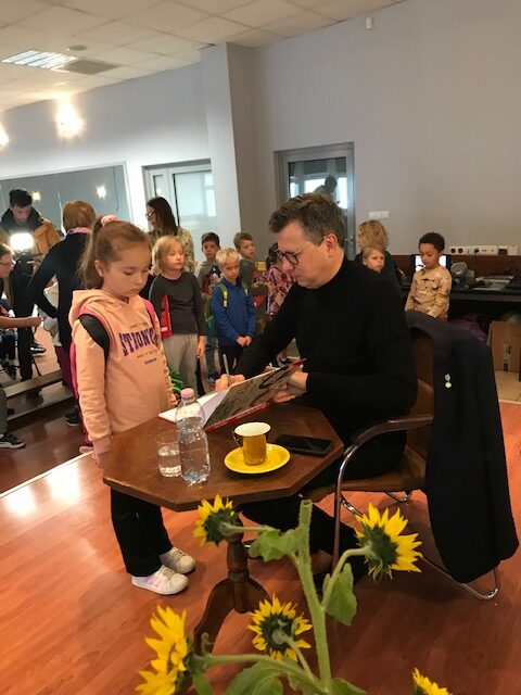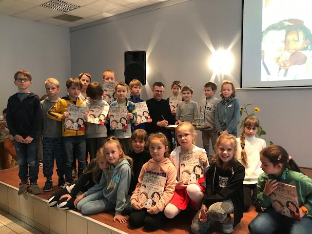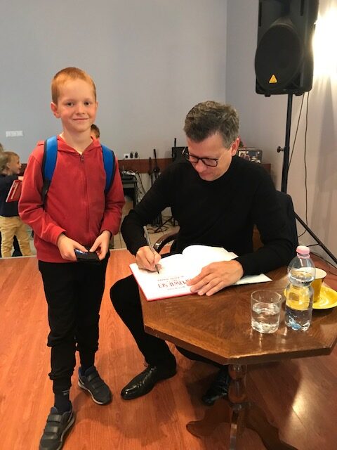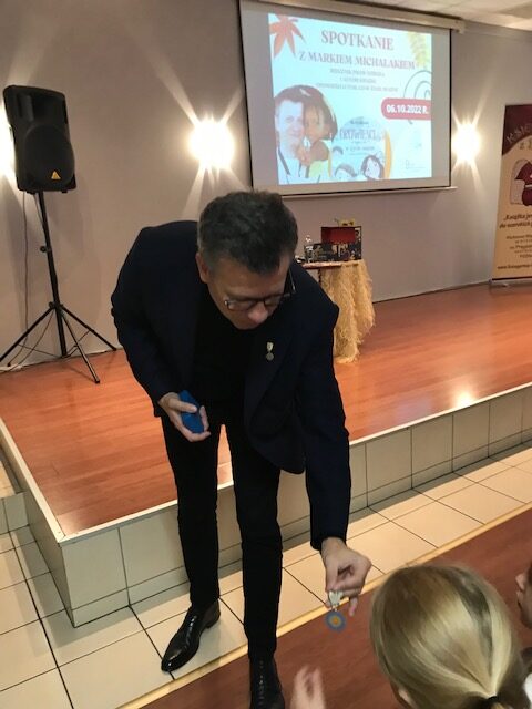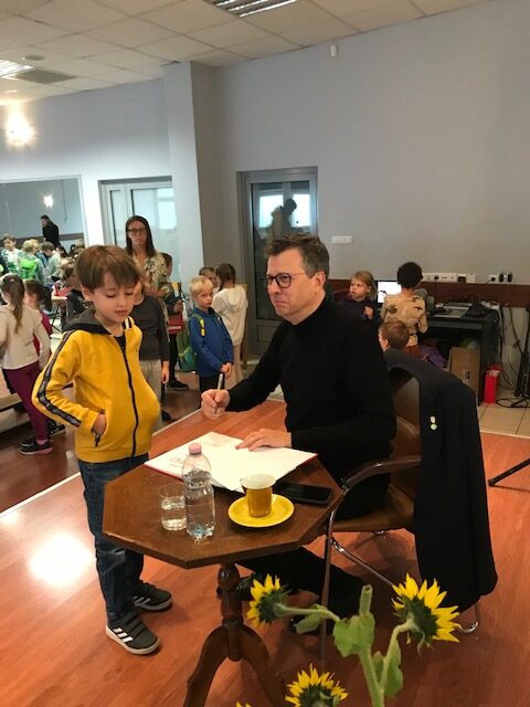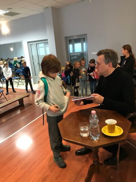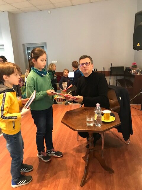 Po czym pan Michalak odpowiadał na pytania zadawane przez dzieci. Punktem kulminacyjnym spotkania były wpisy do książek autorstwa pana Marka Michalaka i specjalne przesłanie dla nas dorosłych oraz wspólne zdjęcie.