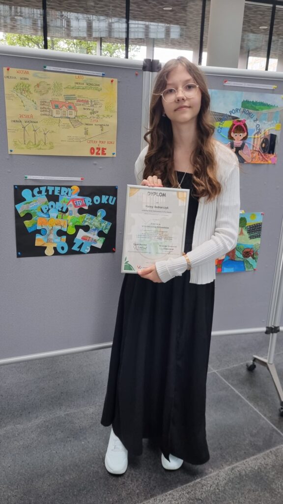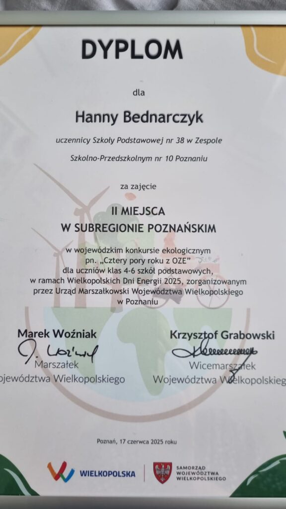 Z ogromną radością informujemy, że Hanna Bednarczyk, uczennica klasy V, zdobyła II miejsce w wojewódzkim konkursie ekologicznym „Cztery Pory Roku z OZE” w kategorii uczniów klas IV–VI (subregion poznański).