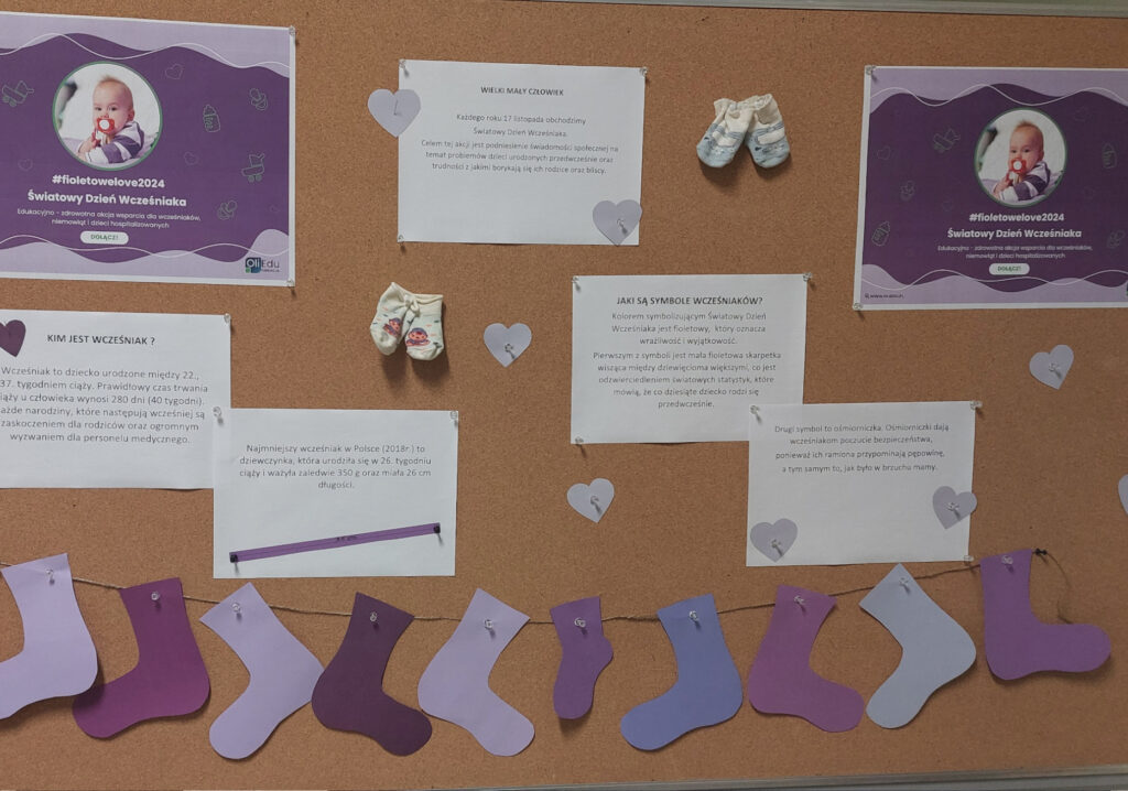 18 listopada nasza szkoła wzięła udział w ogólnopolskiej akcji edukacyjno-zdrowotnej #FioletoweLove2024, zorganizowanej z okazji Światowego Dnia Wcześniaka, przypadającego na 17 listopada. W Polsce inicjatywa ta została zapoczątkowana przez Fundację Wcześniak w 2011 roku. Tego dnia wyraziliśmy nasze wsparcie dla najmłodszych bohaterów – wcześniaków, hospitalizowanych niemowląt oraz ich rodzin.