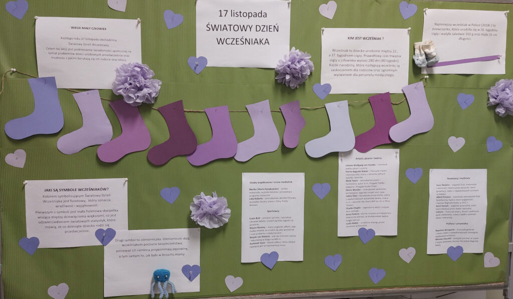 z najmłodszymi bohaterami. Uczniowie, nauczyciele i pracownicy przyszli ubrani w fioletowe stroje, a korytarze i sale lekcyjne wypełniły się tematycznymi dekoracjami. Przygotowano również specjalne gazetki, dzięki którym społeczność szkolna mogła poszerzyć swoją wiedzę na temat wcześniactwa.