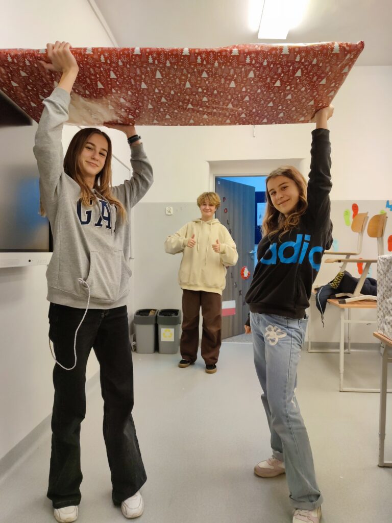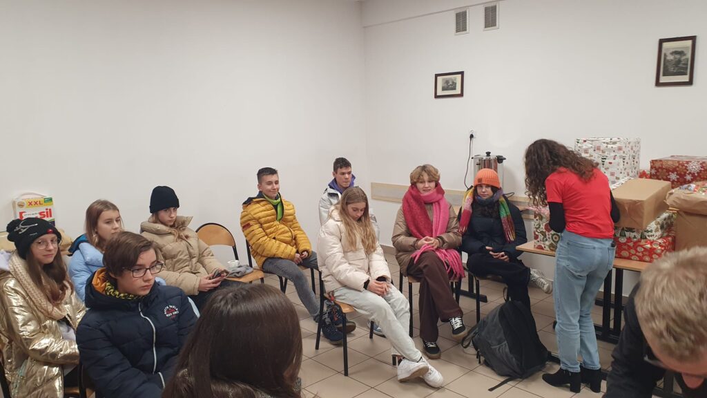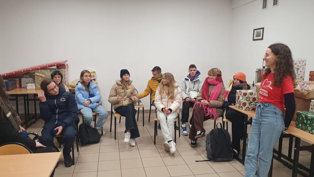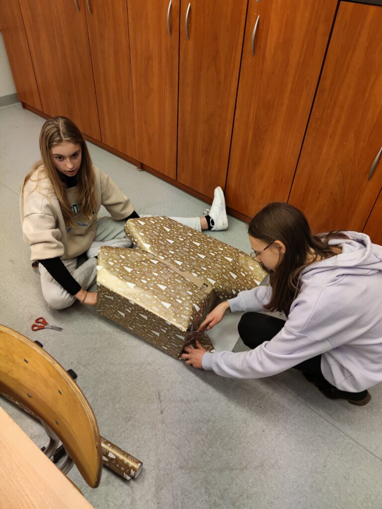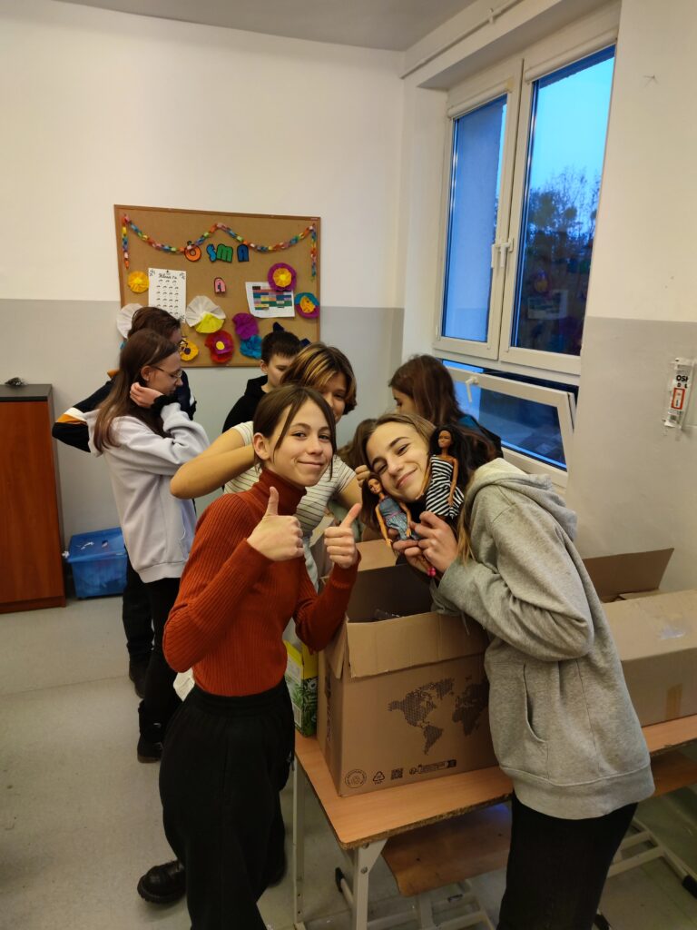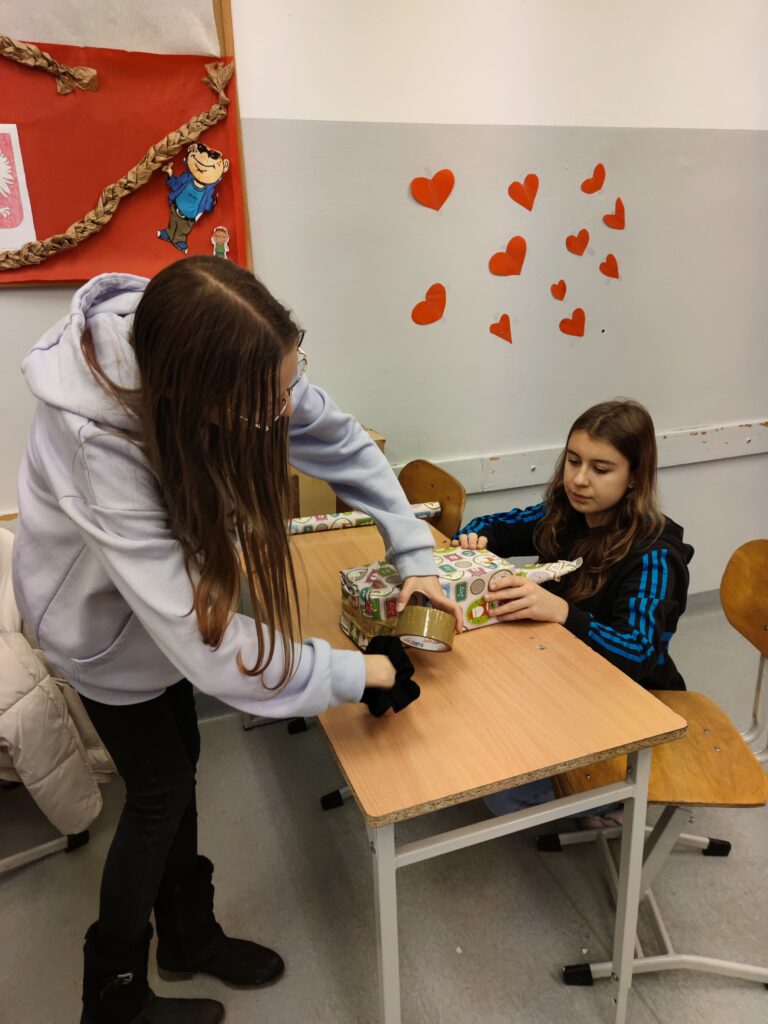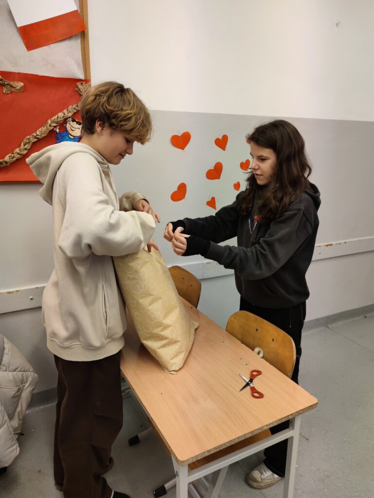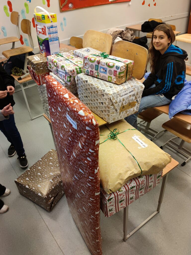 Nastał czas, aby pomóc rodzinie. W oparciu o zadeklarowane potrzeby, uczniowie przygotowali aż 13 paczek dla Pani Marty, Pana Roberta i dzieci. Niektórzy pojawili się w szkole nawet po lekcjach, aby świątecznie zapakować prezenty. W piątek, 9.12.2022 r. o godz. 17.00, uczniowie dostarczyli paczki do magazynu IX Liceum Ogólnokształcącego w Poznaniu, gdzie czekali na nich wolontariusze Szlachetnej Paczki. Tam zostali nagrodzeni dyplomami oraz otrzymali podziękowania za ogrom pracy włożonej w niesienie pomocy innym ludziom.