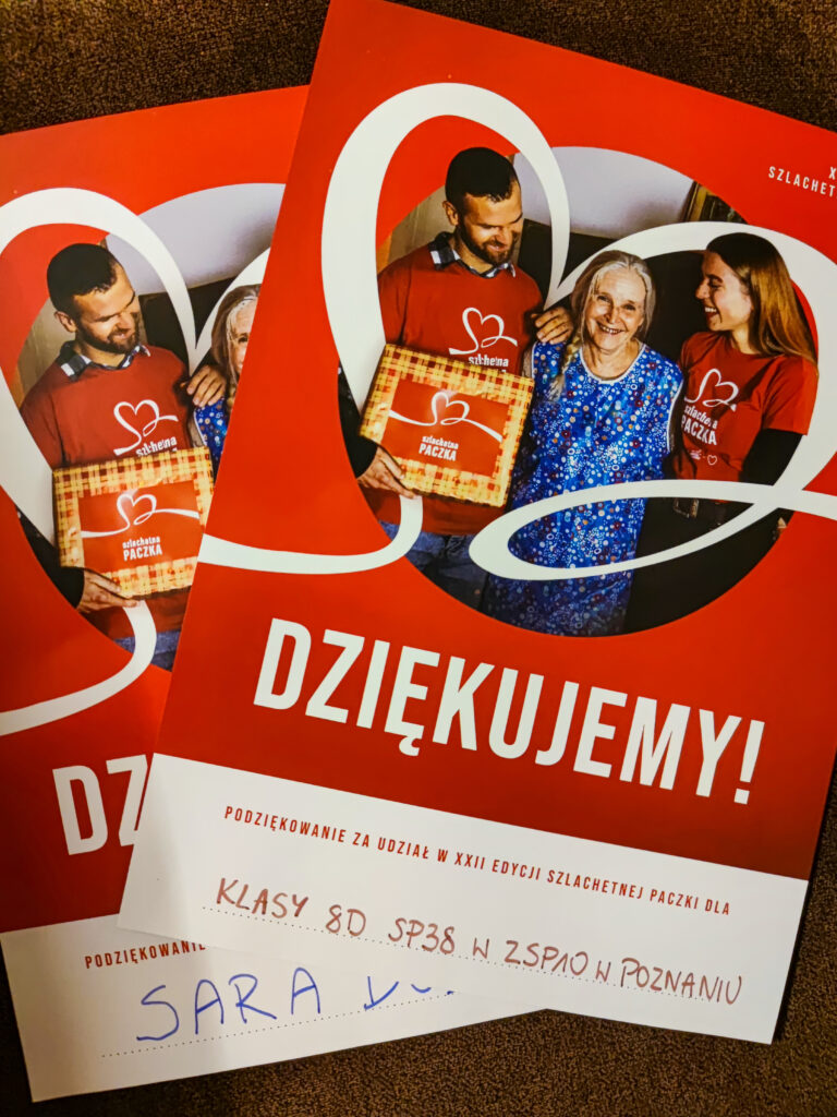 Uczniowie klasy 8d, wraz z wychowawcą, p. Sarą Budną, wzięli udział w kolejnej, XXII edycji ogólnopolskiej akcji pt. „Szlachetna Paczka”, pomagając jednej z wybranych rodzin, zamieszkujących okoliczny teren Winograd.
