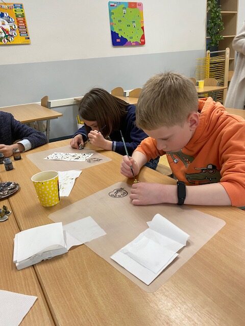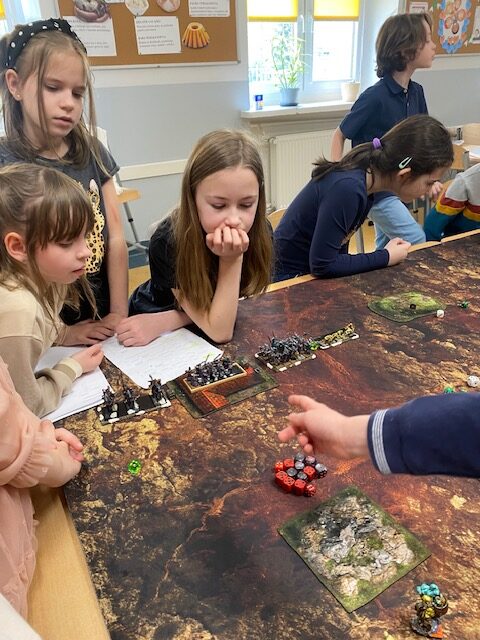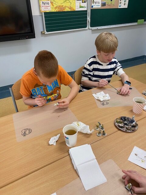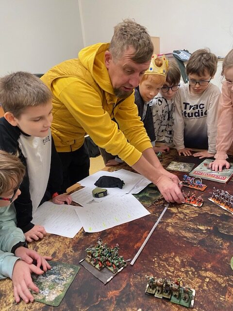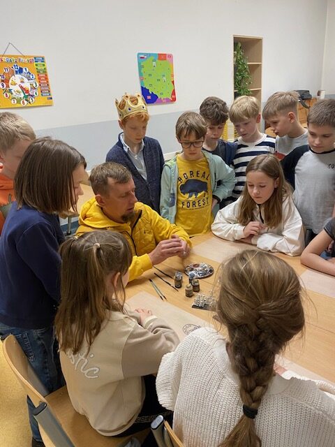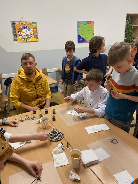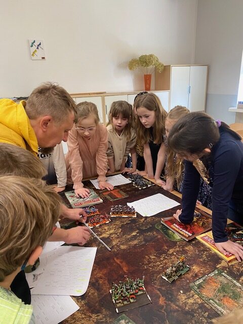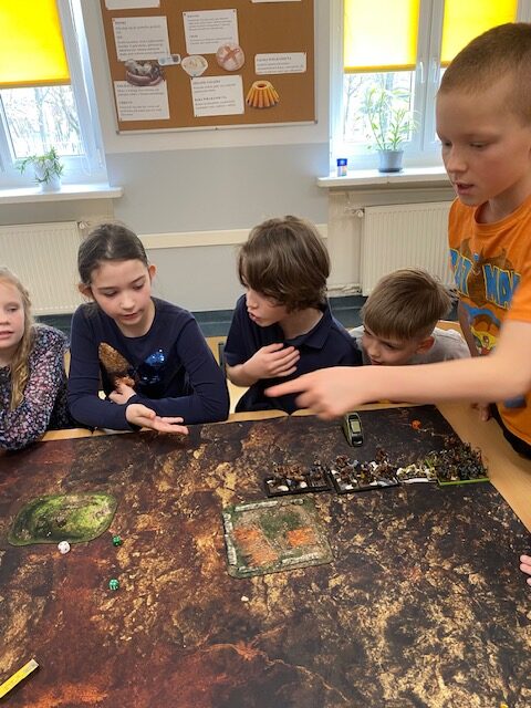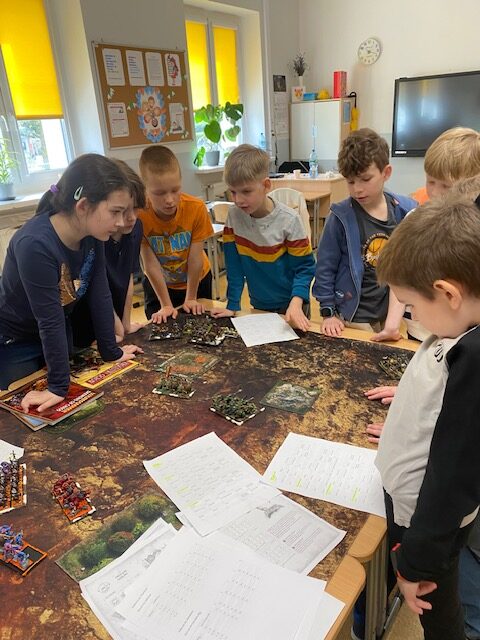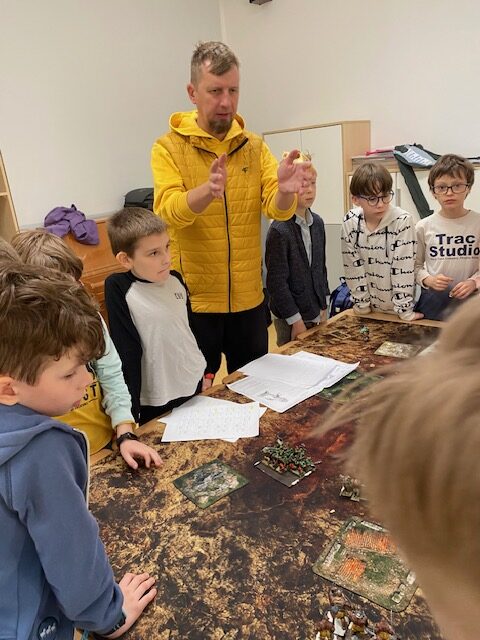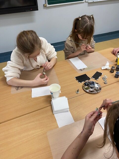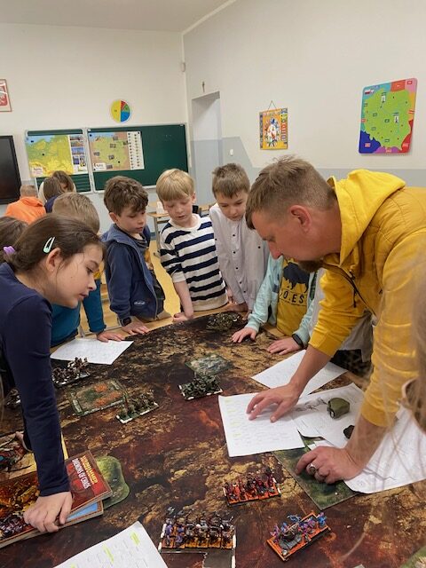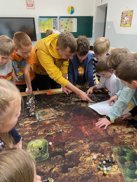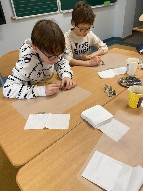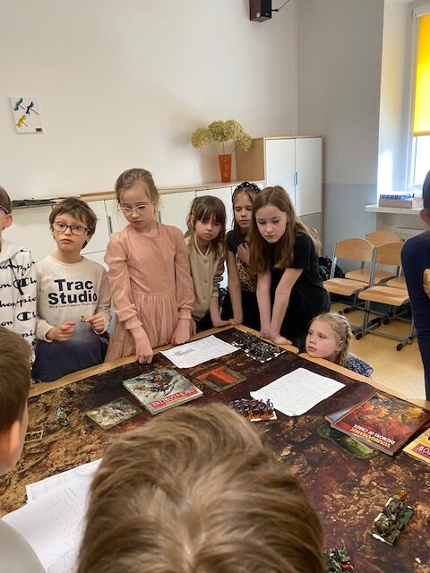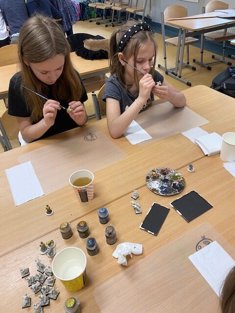 Pan Piotr zaprezentował uczniom element modelarski swojego hobby- miniaturowe figurki fantasty WARHAMMER, takie jak: elfy, krasnoludy, niziołki czy gryfy służące do rozgrywania figurowych gier bitewnych. Po krótkim instruktarzu uczniowie malowali figurki. Następnie zapoznali się z zasadami gry i scenariuszami toczenia potyczek na odpowiednio przygotowanym polu. Za pomocą miniaturowych figur, które symbolizowały cztery poszczególne frakcje armii, przeprowadzili swoje działania bitewne. Potyczki zakończyły się remisem.