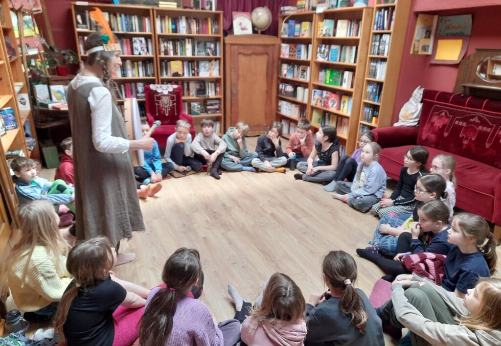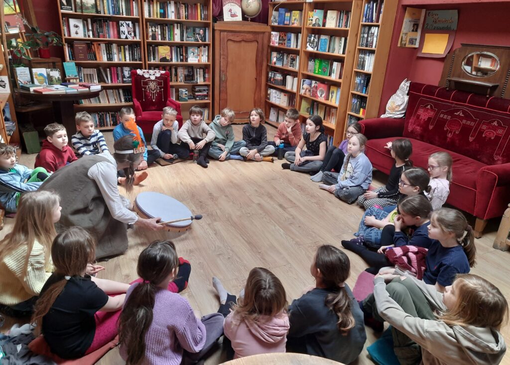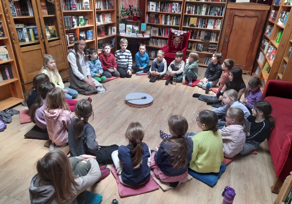 Klasa 2 c odwiedziła księgarnię ,,Z Bajki”. Podczas warsztatów uczniowie słuchali Indiańskiej opowieści o zdobywaniu ognia przez małego oposa ze zbioru ,,Opowiadacze świata” Anety Cruz-Kąciak.