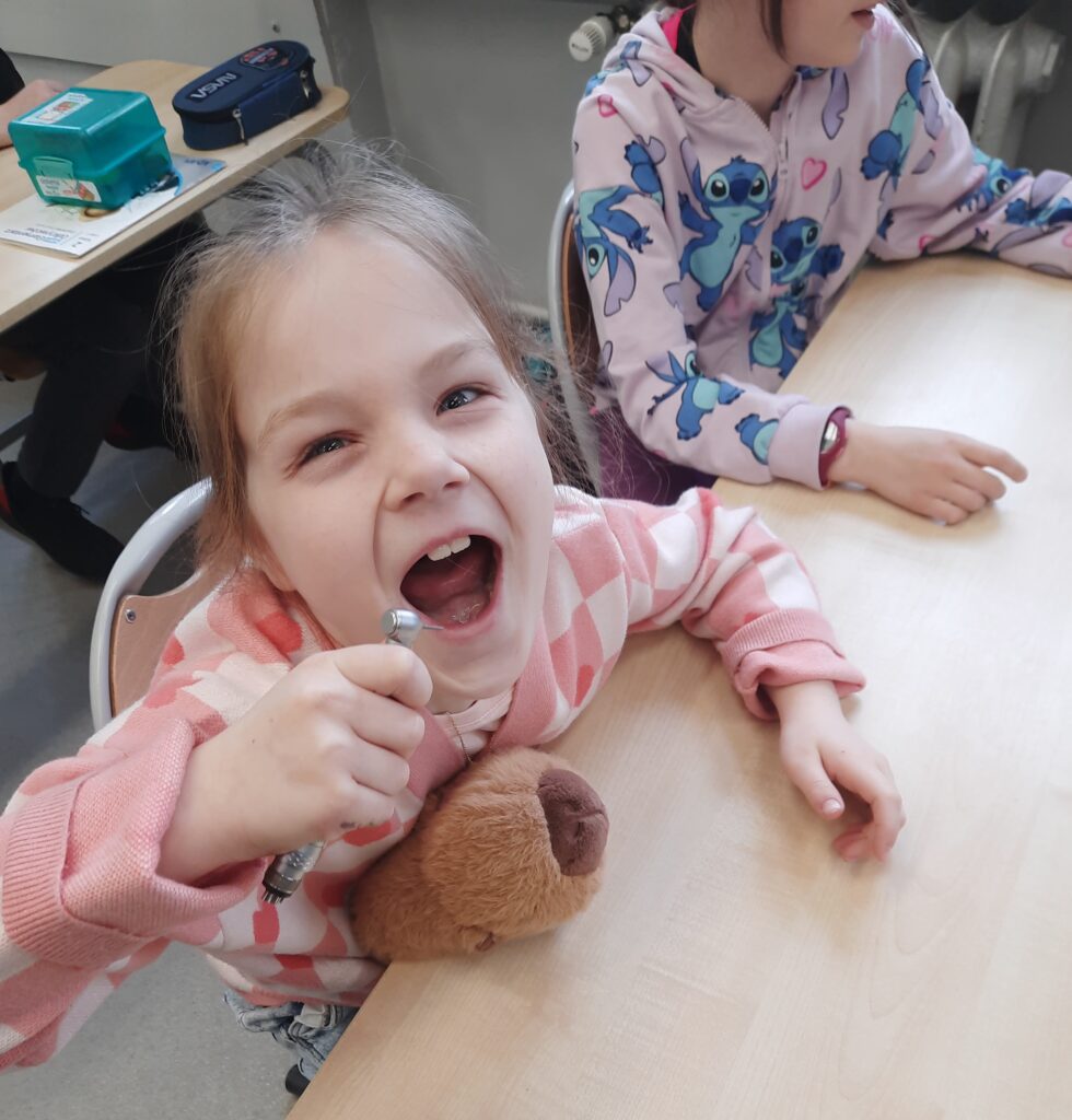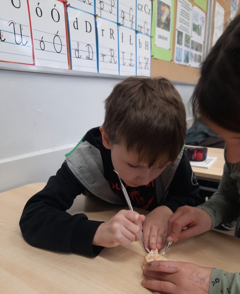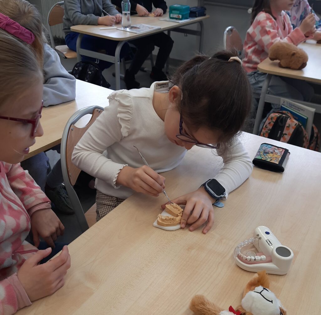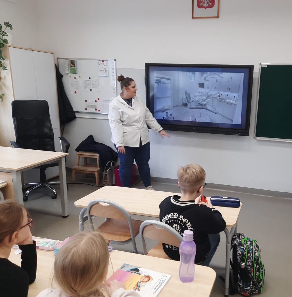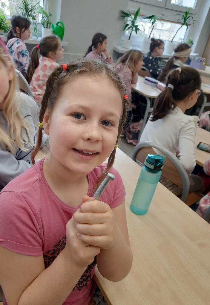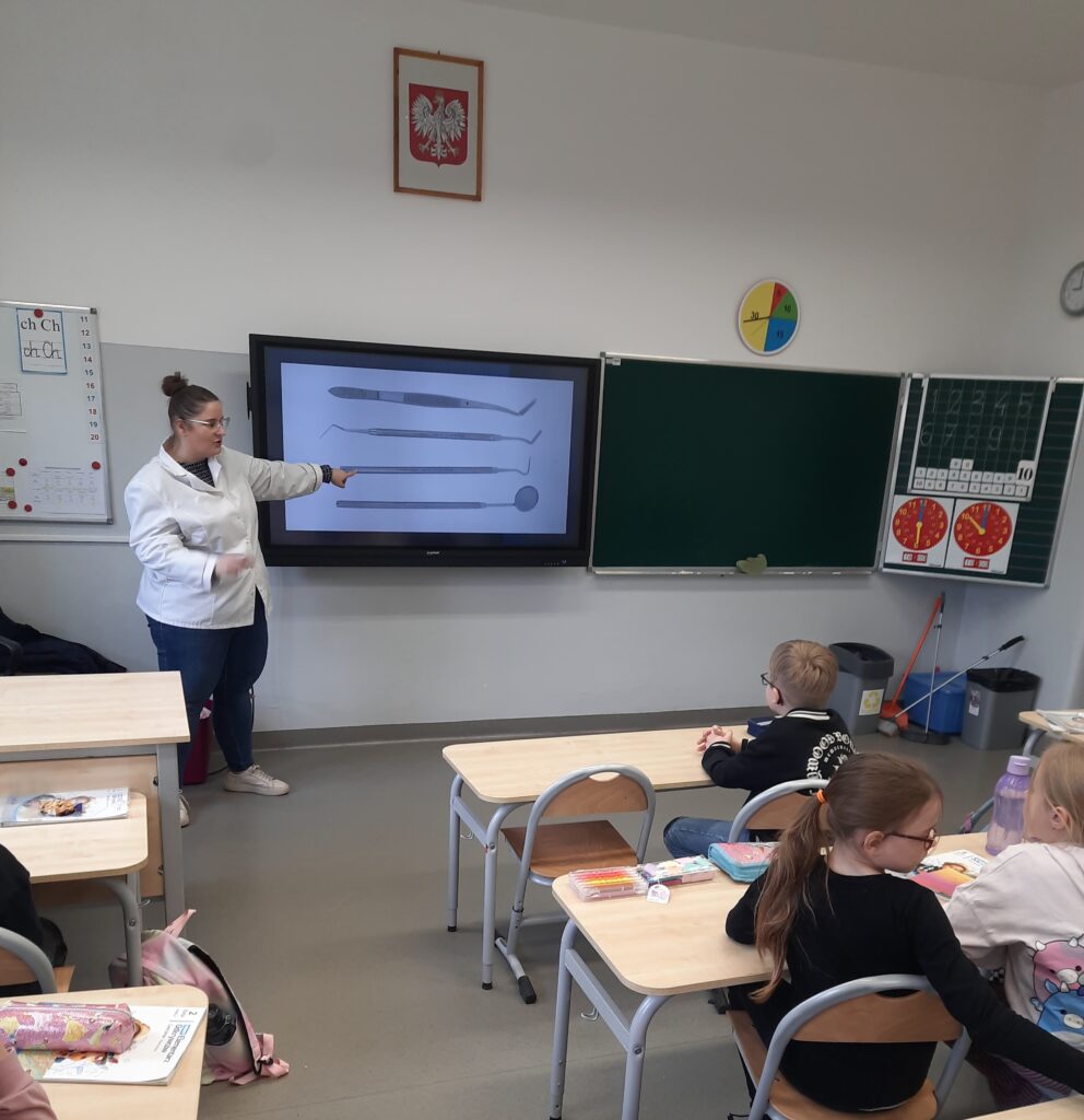 Pani Maria pracuje jako stomatolog w Gabinecie M2 Clinic (www.m2clinic.pl), prywatnie mama Hani. Podczas wizyty w szkole poprowadziła warsztaty dla klasy 2c. Dzieci mogły wypełnić ubytki w gipsowych odlewach zębów, które później Pani Maria utwardzała lampą, czyli powstała tzw. plomba. Uczniowie z bliska oglądali narzędzia stomatologiczne. Mama Hani poprowadziła także prelekcję dotyczącą właściwej higieny jamy ustnej oraz o tym jak dbać o zęby. Podczas spotkania uczniowie dowiedzieli się do czego służy sprzęt w gabinecie stomatologicznym. Na koniec każdy uczeń otrzymał upominki.