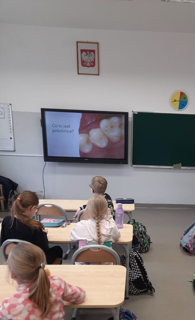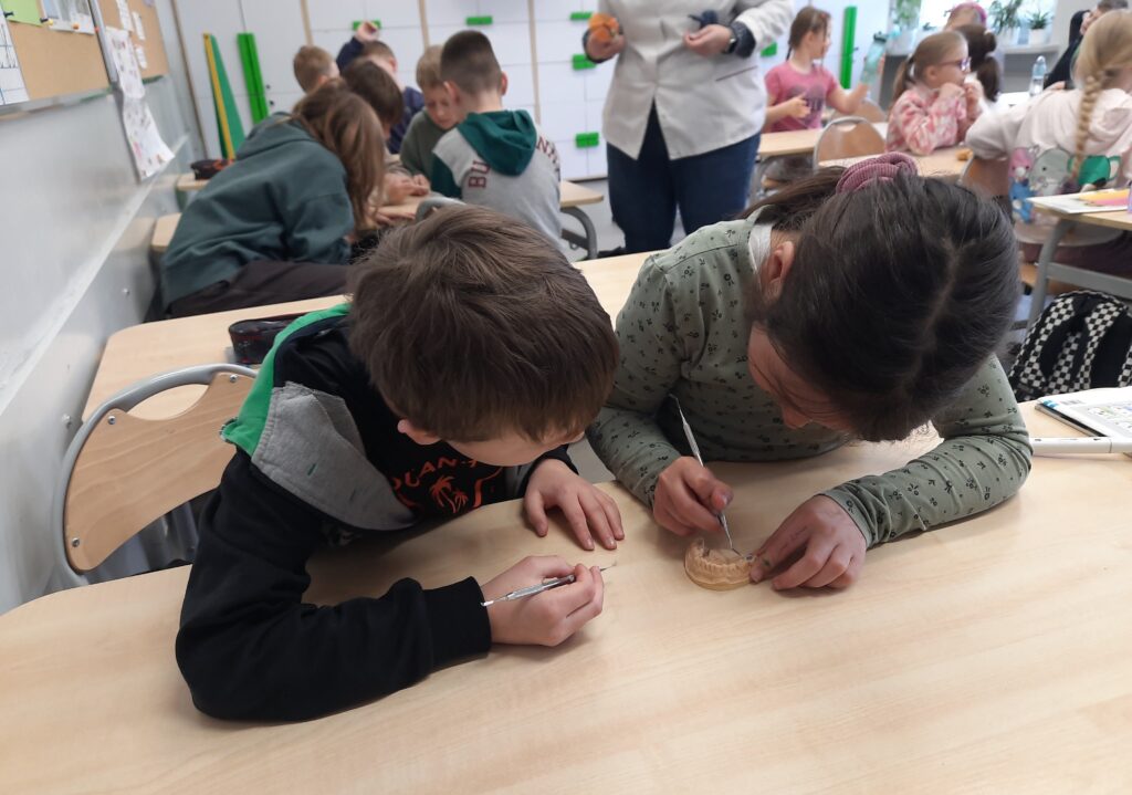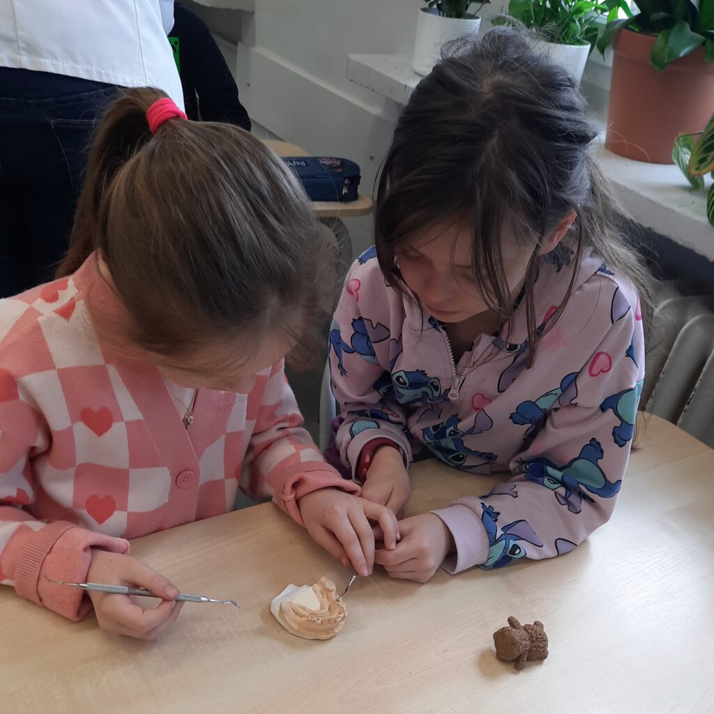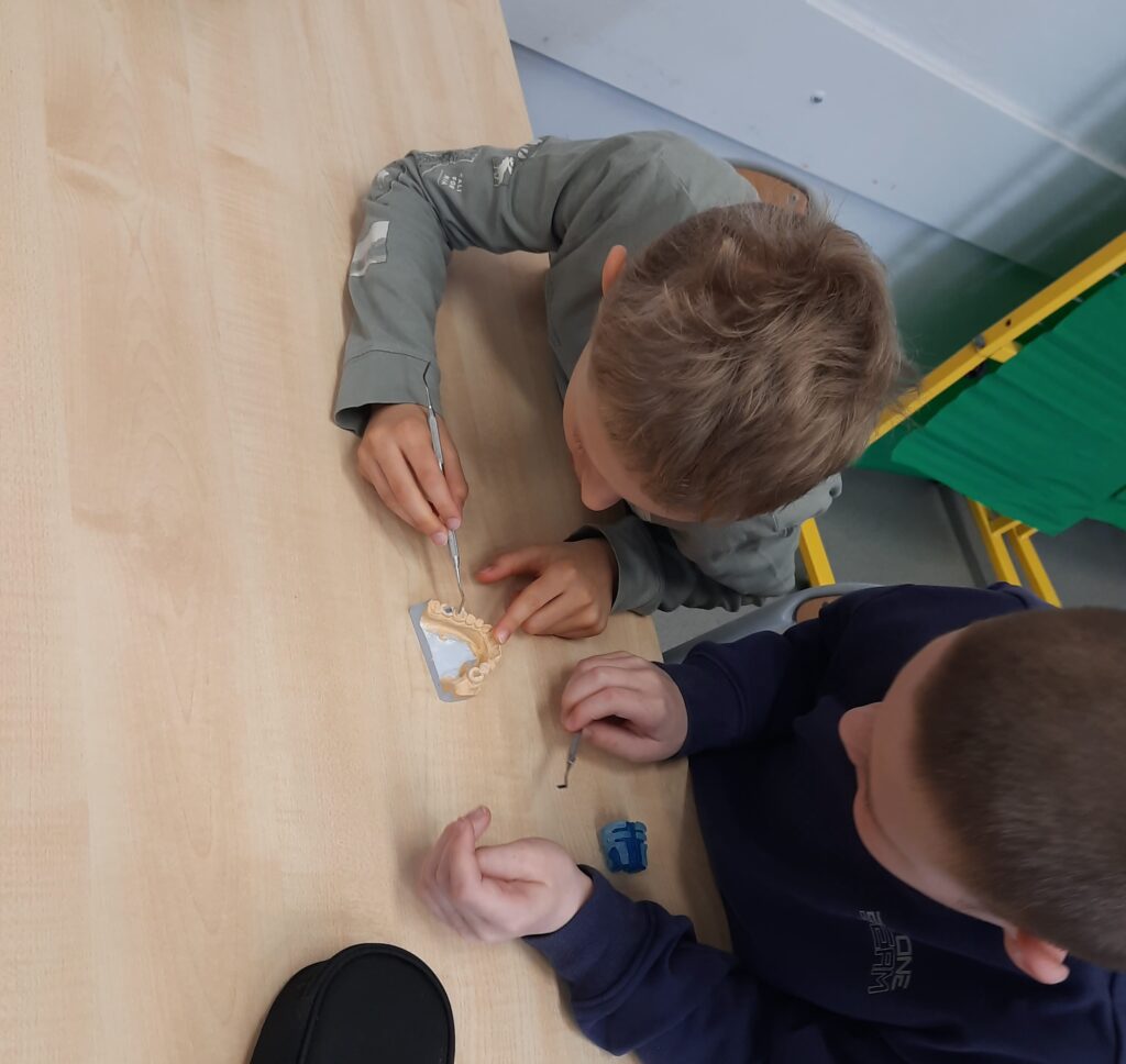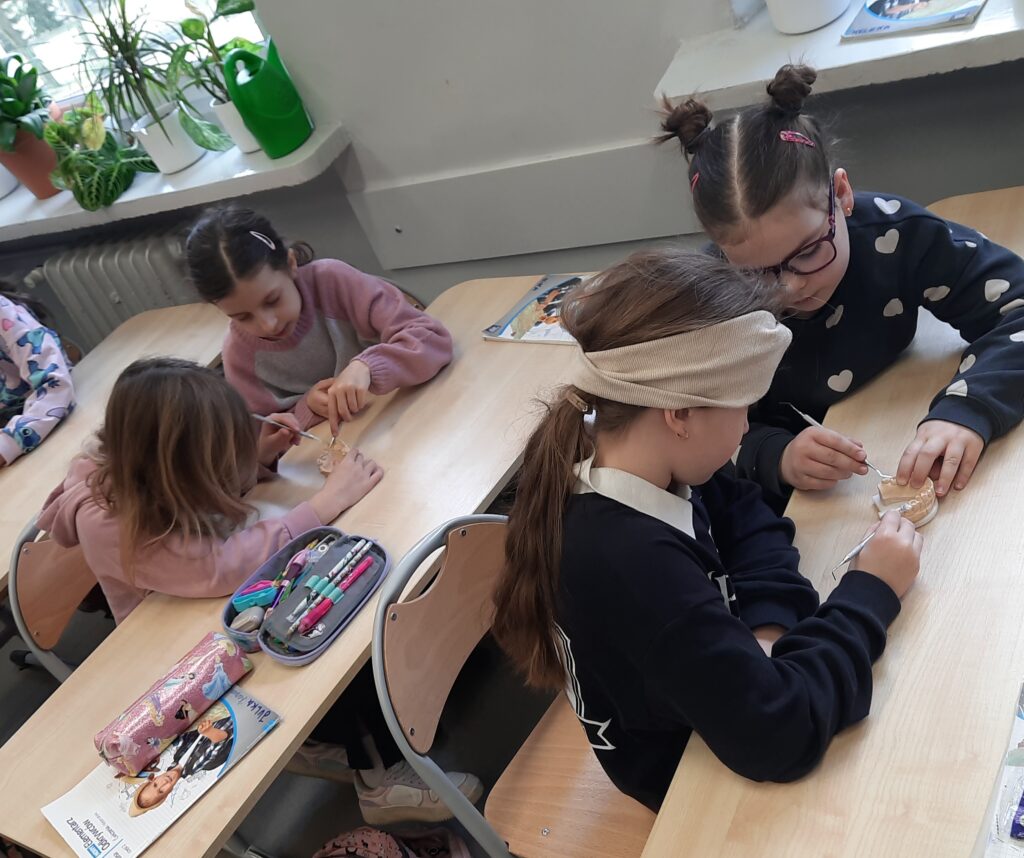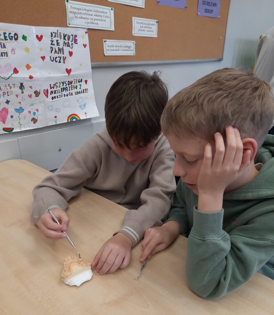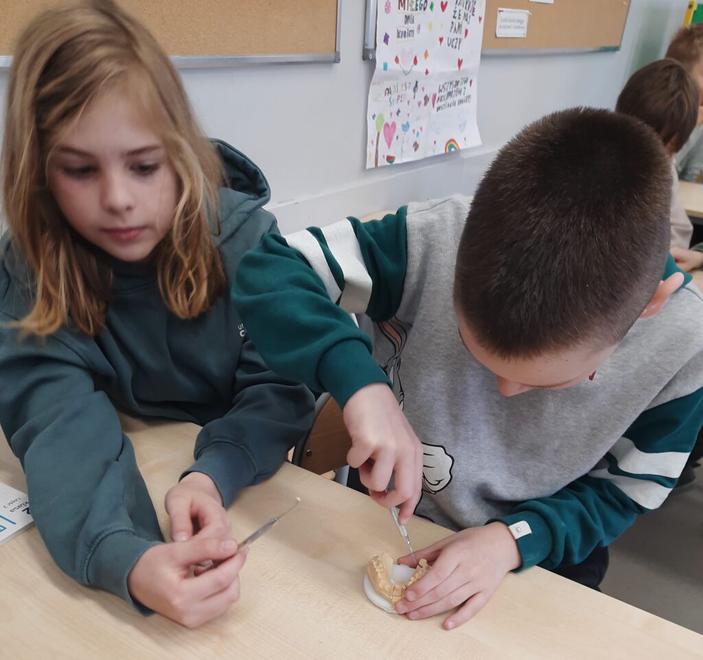 Pani Maria pracuje jako stomatolog w Gabinecie M2 Clinic (www.m2clinic.pl), prywatnie mama Hani. Podczas wizyty w szkole poprowadziła warsztaty dla klasy 2c. Dzieci mogły wypełnić ubytki w gipsowych odlewach zębów, które później Pani Maria utwardzała lampą, czyli powstała tzw. plomba. Uczniowie z bliska oglądali narzędzia stomatologiczne. Mama Hani poprowadziła także prelekcję dotyczącą właściwej higieny jamy ustnej oraz o tym jak dbać o zęby. Podczas spotkania uczniowie dowiedzieli się do czego służy sprzęt w gabinecie stomatologicznym. Na koniec każdy uczeń otrzymał upominki.