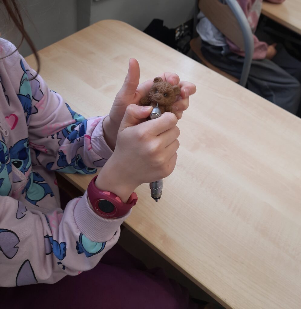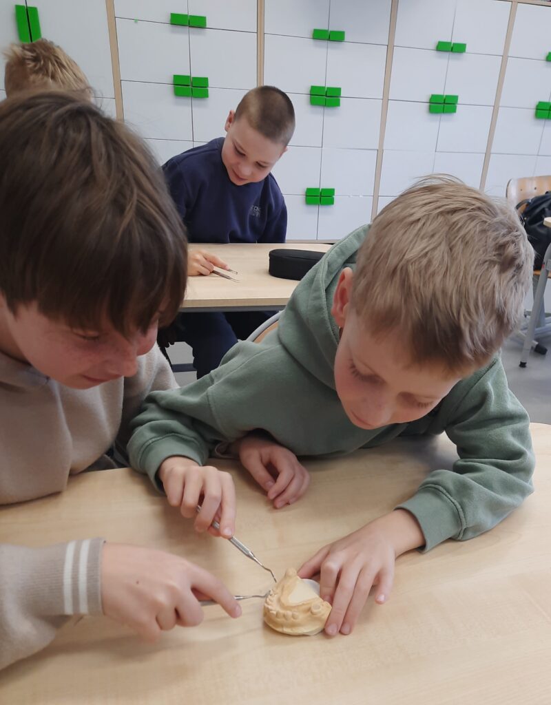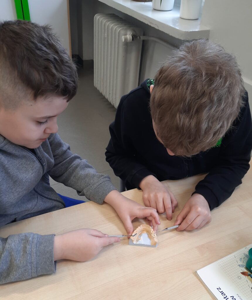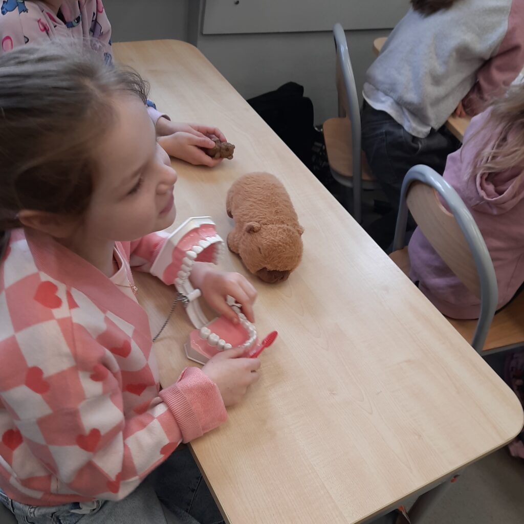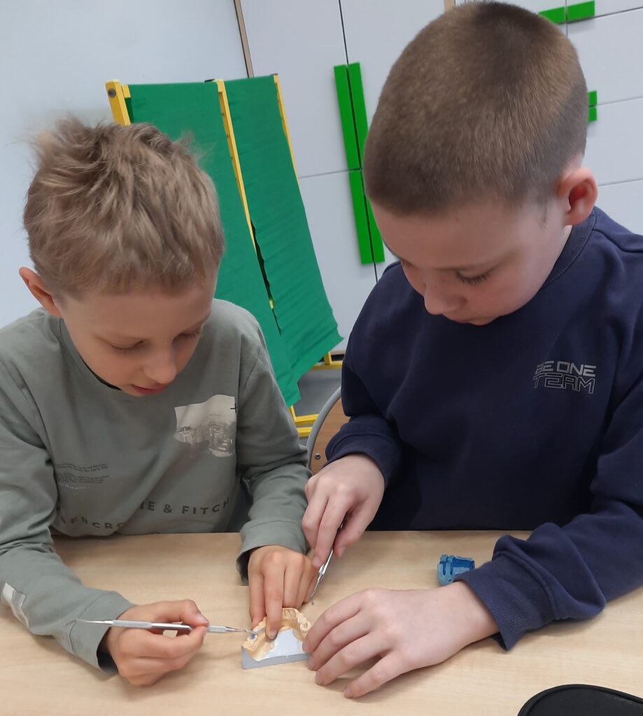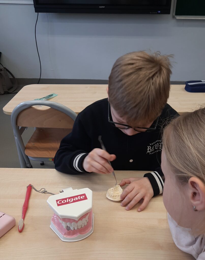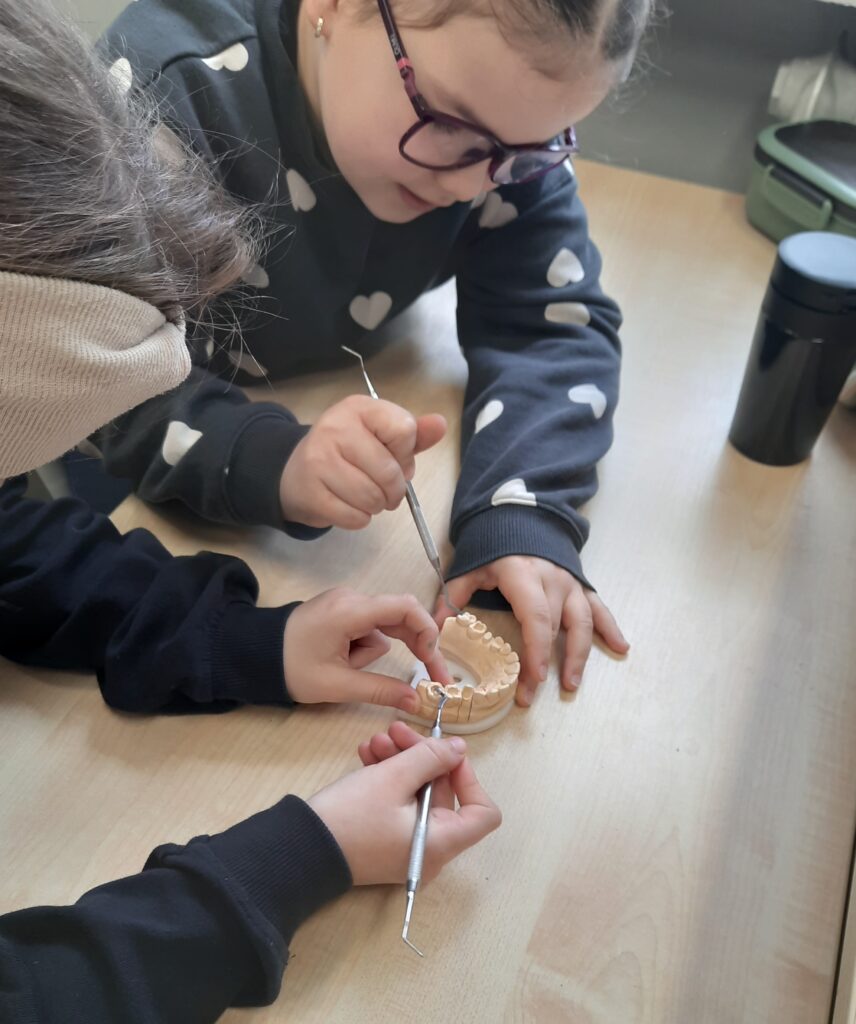 Pani Maria pracuje jako stomatolog w Gabinecie M2 Clinic (www.m2clinic.pl), prywatnie mama Hani. Podczas wizyty w szkole poprowadziła warsztaty dla klasy 2c. Dzieci mogły wypełnić ubytki w gipsowych odlewach zębów, które później Pani Maria utwardzała lampą, czyli powstała tzw. plomba. Uczniowie z bliska oglądali narzędzia stomatologiczne. Mama Hani poprowadziła także prelekcję dotyczącą właściwej higieny jamy ustnej oraz o tym jak dbać o zęby. Podczas spotkania uczniowie dowiedzieli się do czego służy sprzęt w gabinecie stomatologicznym. Na koniec każdy uczeń otrzymał upominki.