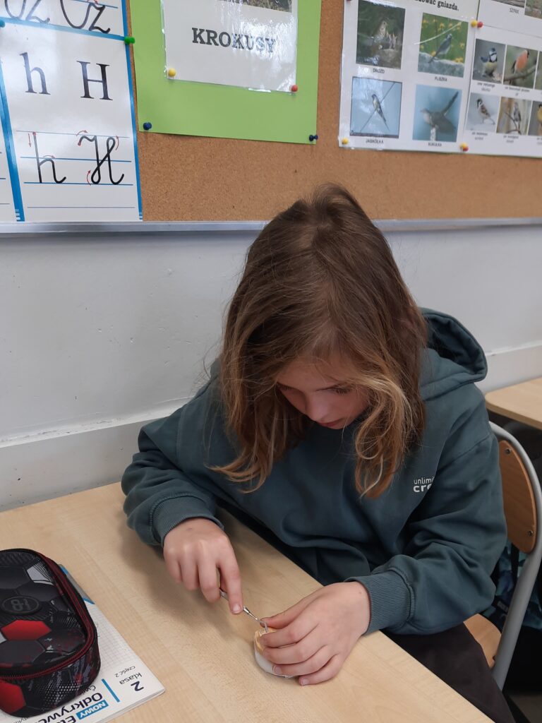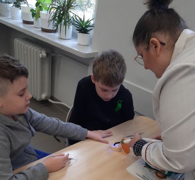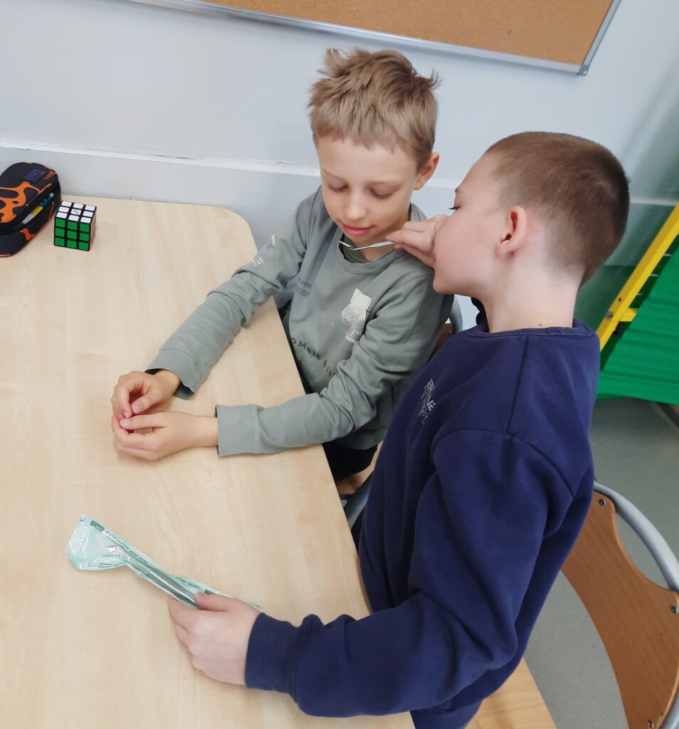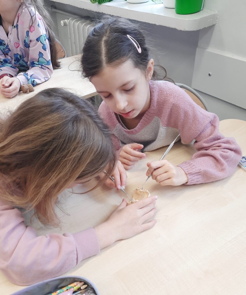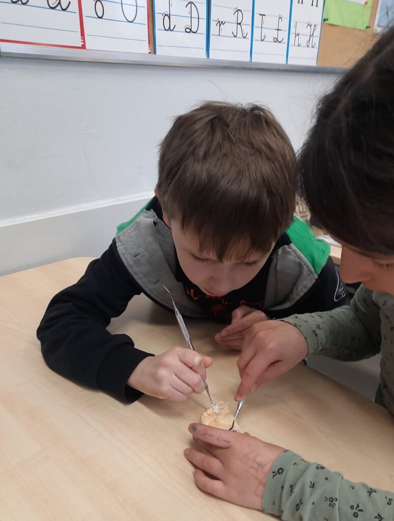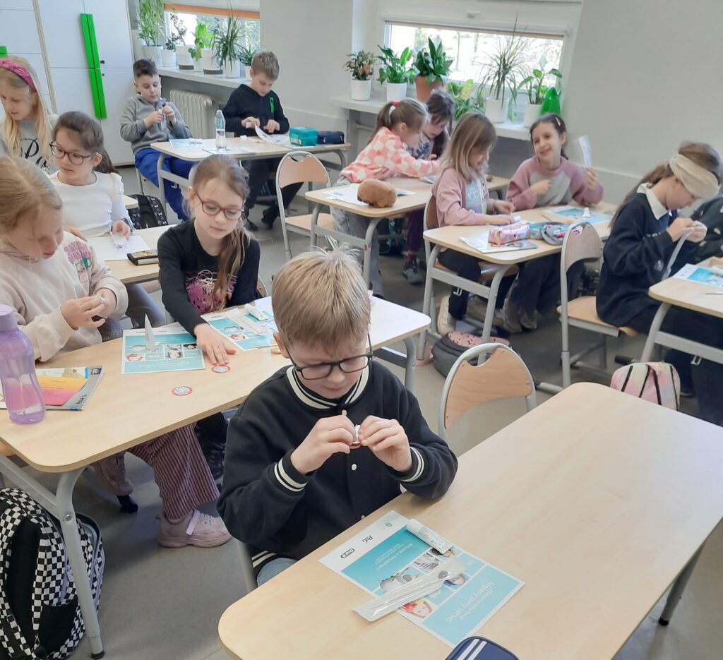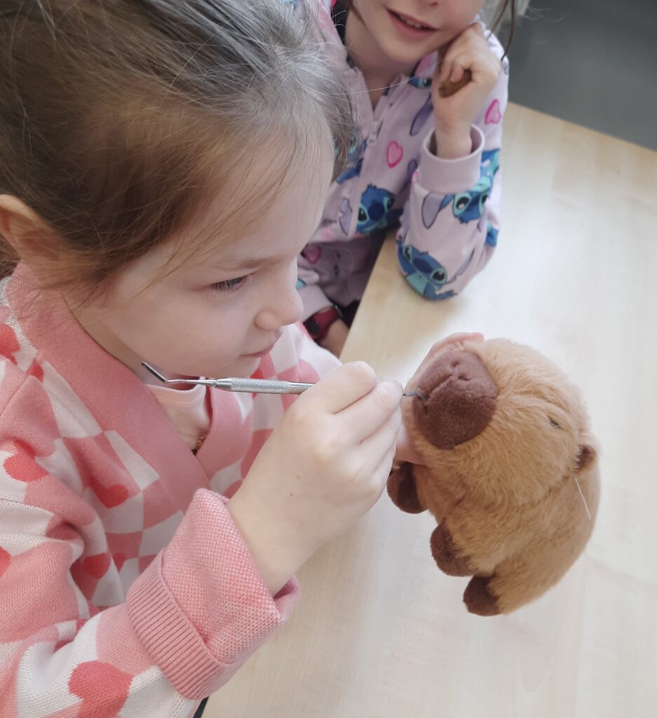 Pani Maria pracuje jako stomatolog w Gabinecie M2 Clinic (www.m2clinic.pl), prywatnie mama Hani. Podczas wizyty w szkole poprowadziła warsztaty dla klasy 2c. Dzieci mogły wypełnić ubytki w gipsowych odlewach zębów, które później Pani Maria utwardzała lampą, czyli powstała tzw. plomba. Uczniowie z bliska oglądali narzędzia stomatologiczne. Mama Hani poprowadziła także prelekcję dotyczącą właściwej higieny jamy ustnej oraz o tym jak dbać o zęby. Podczas spotkania uczniowie dowiedzieli się do czego służy sprzęt w gabinecie stomatologicznym. Na koniec każdy uczeń otrzymał upominki.