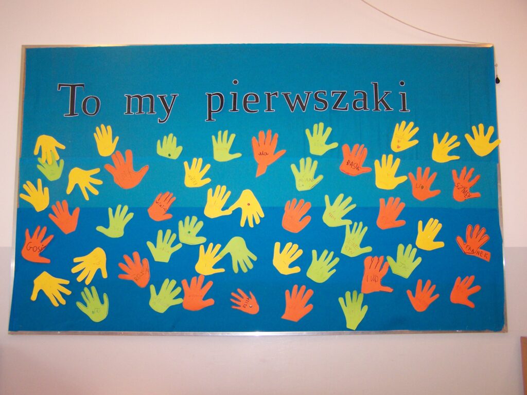 W pierwszych dniach września dołączyła do nas liczna grupa pierwszoklasistów, ze wszystkich trzech klas. Niektóre dzieci mogły odszukać na tablicy w sali nr 7 swoje, odrysowane na kolorowym papierze i podpisane rączki – „ślady” pozostawione na czerwcowych zajęciach adaptacyjnych. Przyjemnie było się rozpoznać i wspomnieć pierwsze szkolne zajęcia.