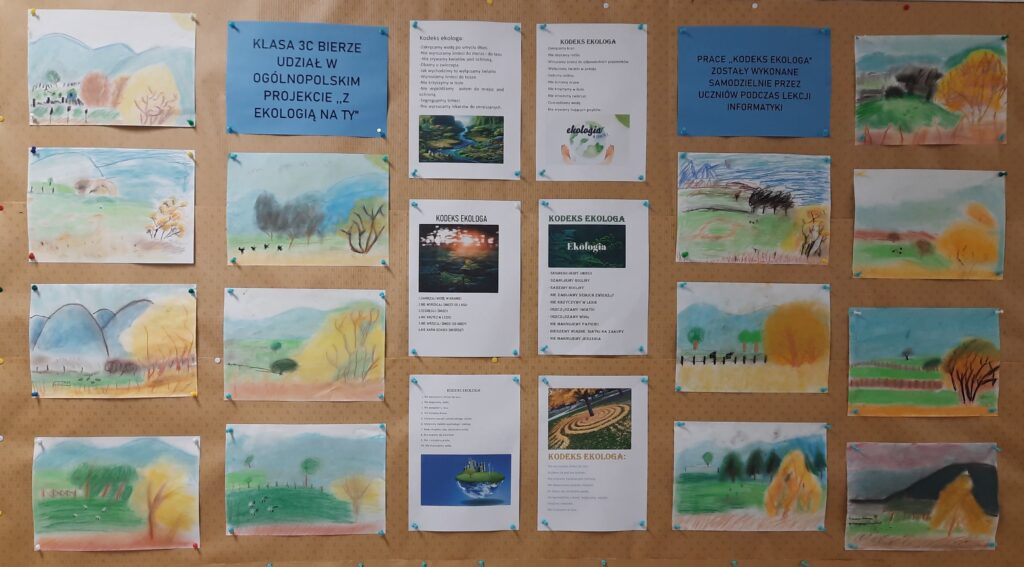 Klasa 3c bierze udział w Ogólnopolskim Projekcie Edukacyjnym ,,Z ekologią na TY”. Przez cały rok uczniowie będą wykonywać różne zadania dotyczące ochrony środowiska oraz dbania o zdrowie. Podczas lekcji informatyki dzieci samodzielnie stworzyły plakat z istotnymi dla nich działaniami proekologicznymi.