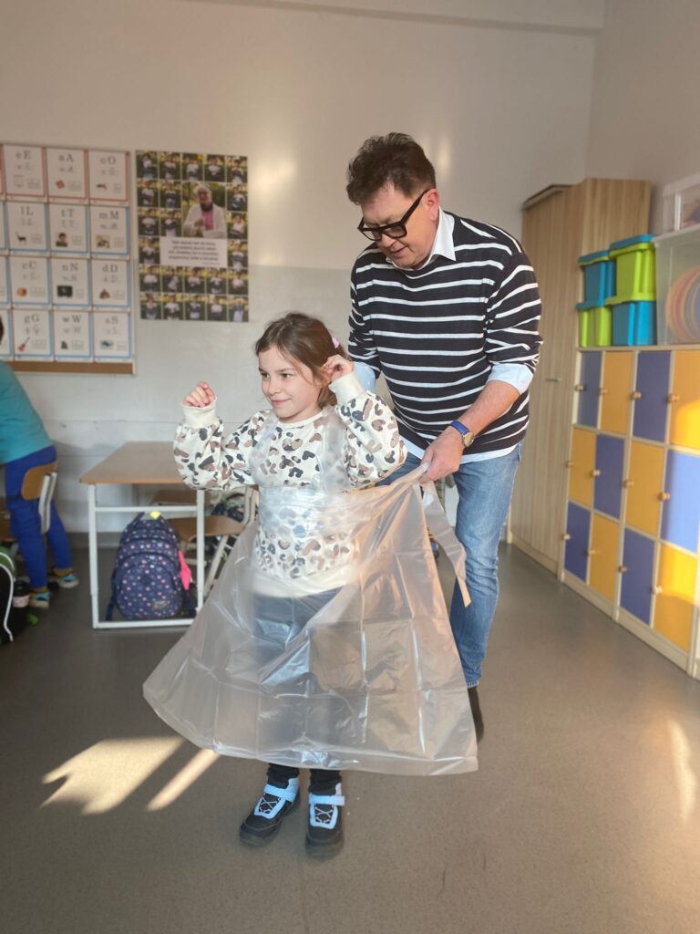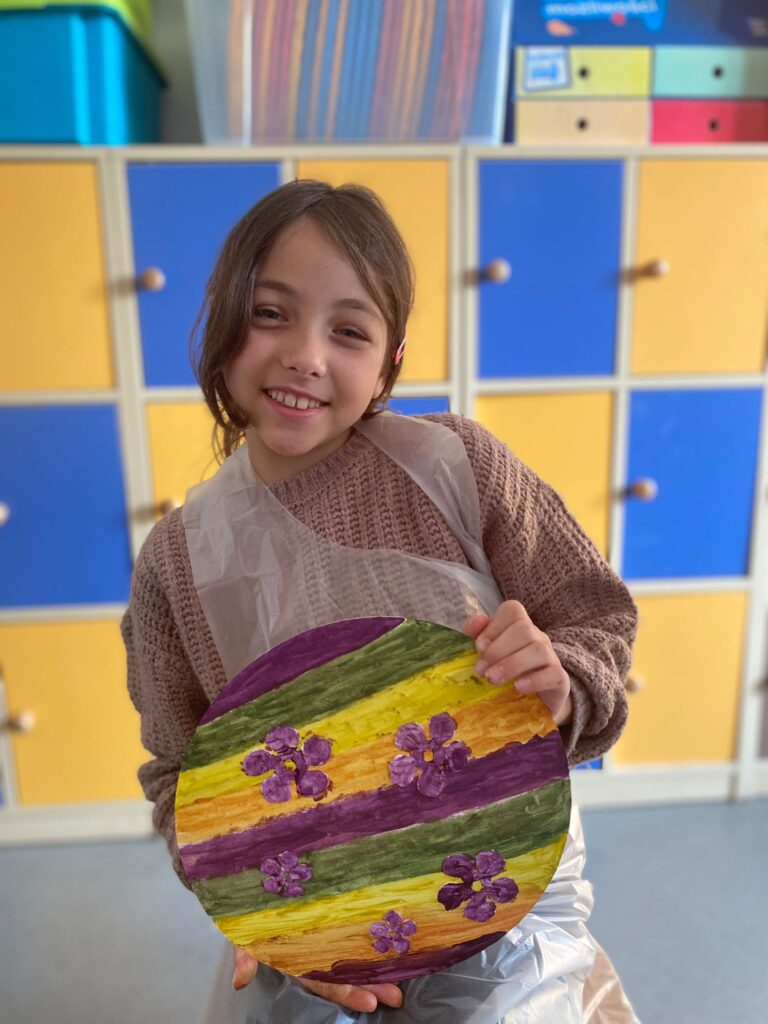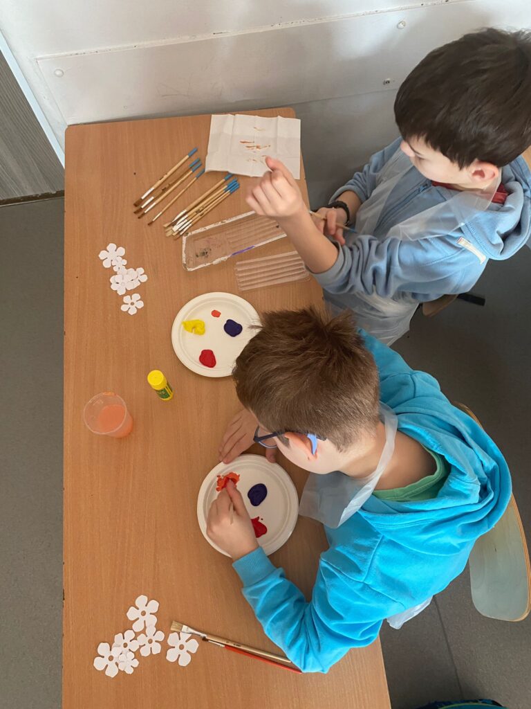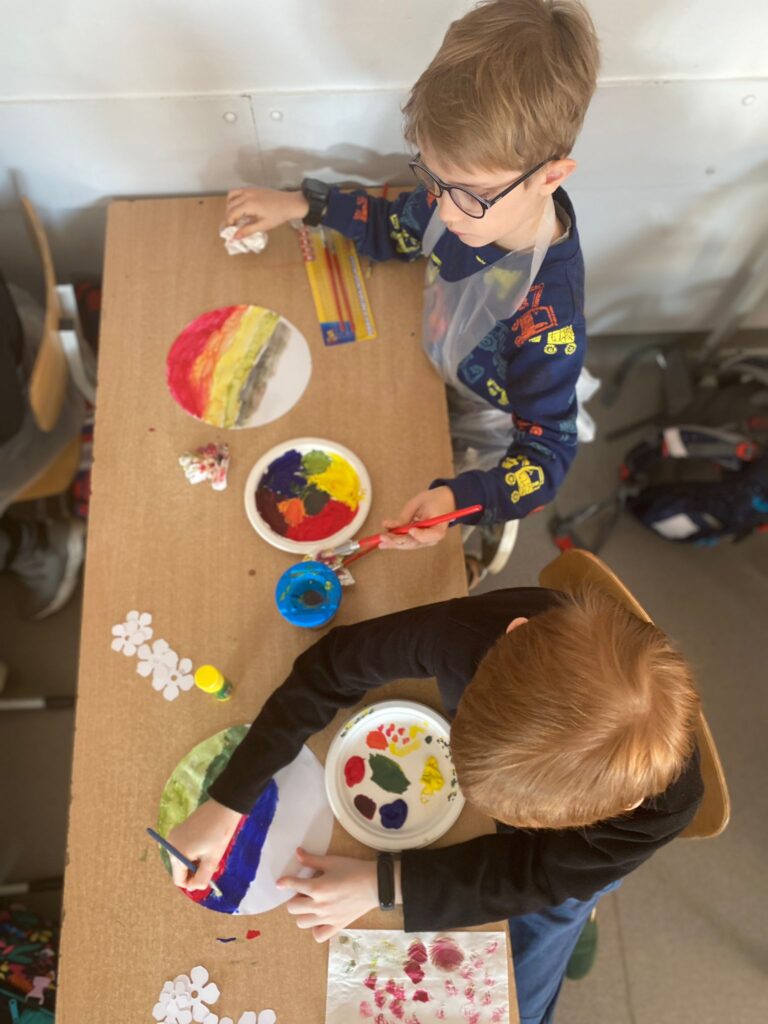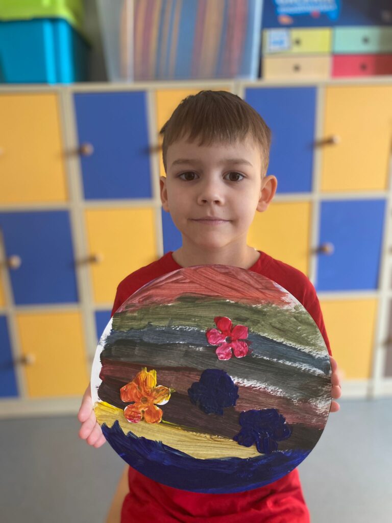Uczniowie dowiedzieli się w jaki sposób powstają obrazy, zdobyli nowe wiadomości o technikach i przyborach malarskich, nauczyli się mieszać kolory. Zainspirowani  opowiadaniem artysty namalował  piękne abstrakcyjne  obrazki o tematyce wiosennej.